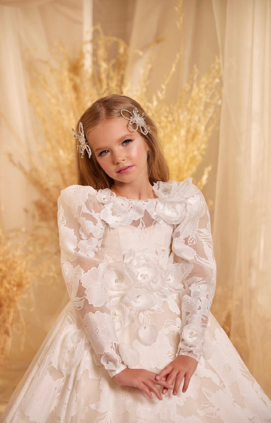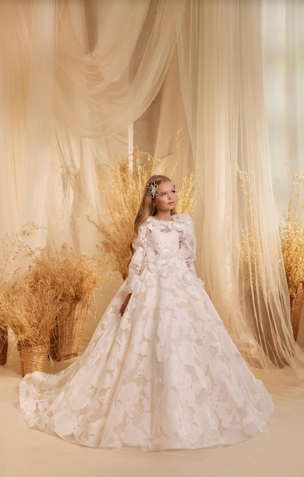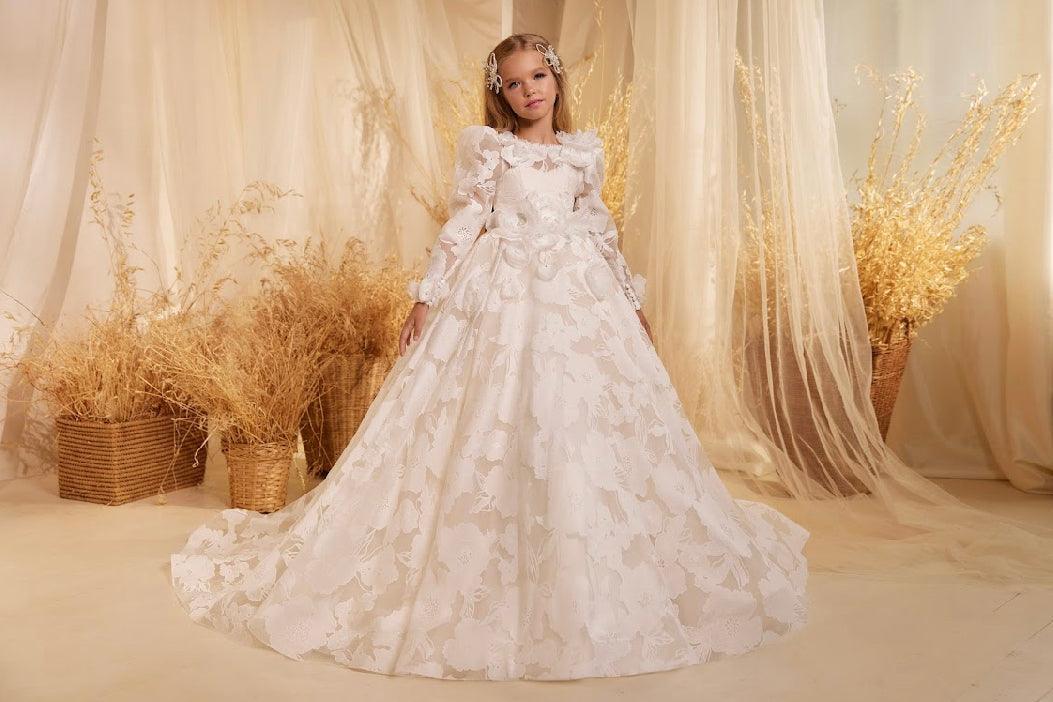 This is a magical dress fit for a young flower girl! Crafted in a dreamy ivory hue, it's an instant eye-catcher. The dress is adorned with a delicate lace overlay featuring intricate patterns of leaves and florals.