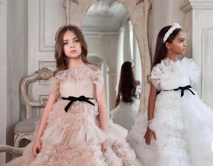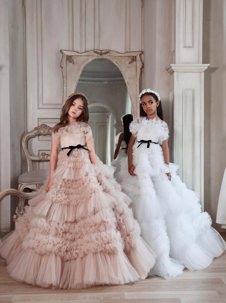 A sophisticated A-line tulle ruffled dress for princesses. This lovely gown features a sleeveless sheer-shoulder top, which is framed with ruffle detailing. The bodice has a keyhole back with button closure. A long A-line multi-tiered ruffled skirt makes it almost to the floor. The tiny black velvet waistband finishes with a small black bow at the front.