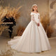 A distinguishing feature of this gown is its chic off-the-shoulder style with an illusion neckline, complemented by a smooth, wide-draped collar that beautifully frames the neckline.