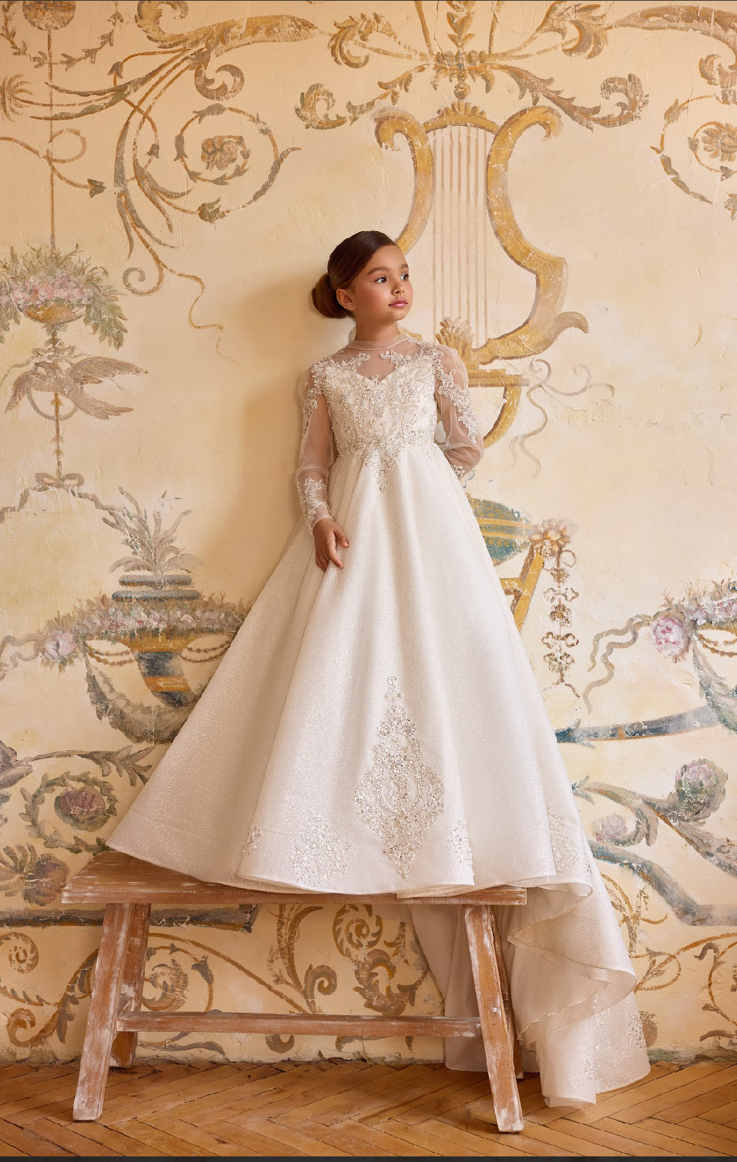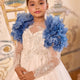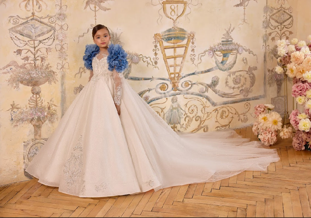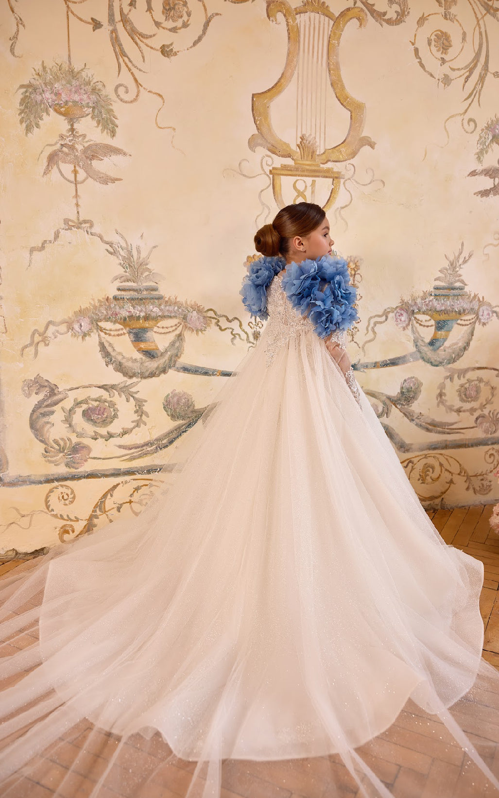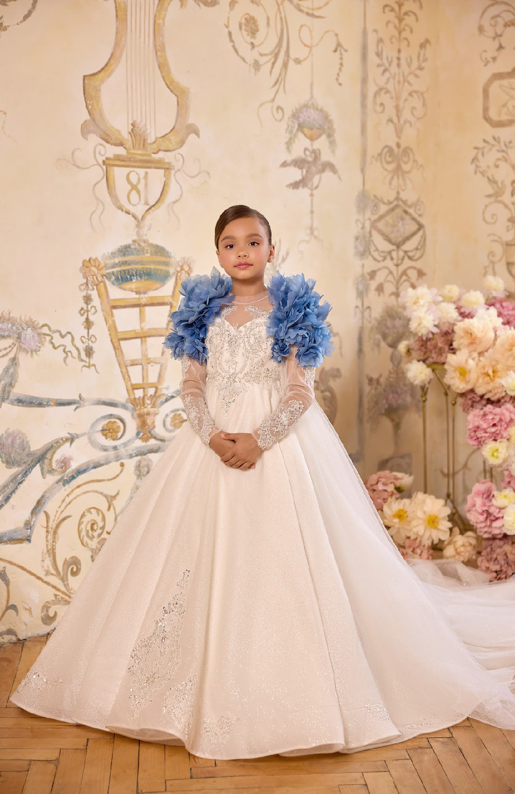What makes this gown truly unforgettable is its statement floral shoulder cape—voluminous layered blue blooms that create a breathtaking silhouette and elevate the look to runway royalty. The chapel-length train flows behind like a cloud of grace, making this gown a show-stopping choice for communions, red-carpet events, birthday galas, or pageants fit for a princess.