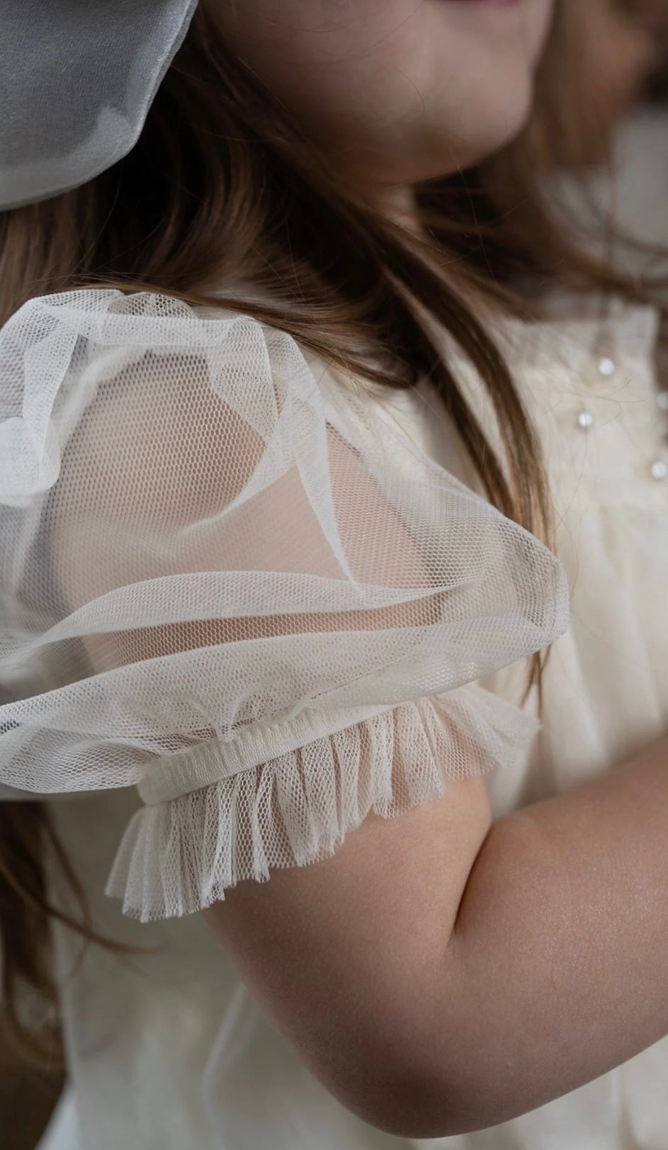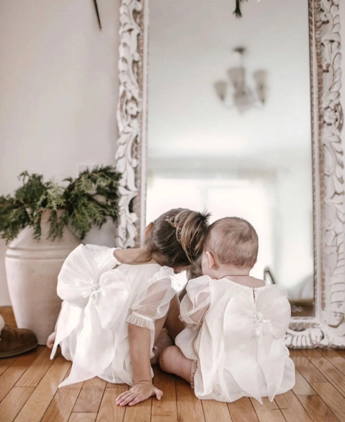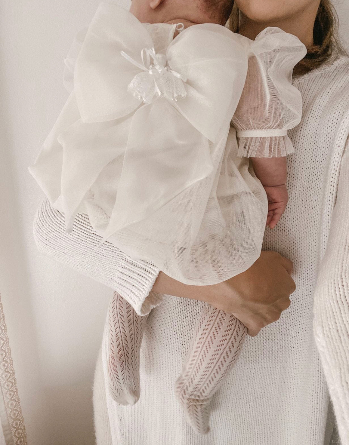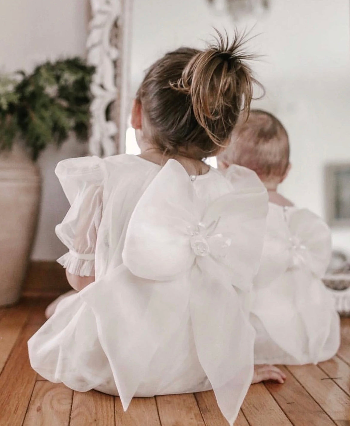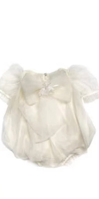 - Design: Featuring delicate puff sleeves and an enchanting sheer bow detail on the back, this romper radiates elegance and charm. The lightweight and breathable fabric ensures your baby stays comfortable while looking absolutely adorable.