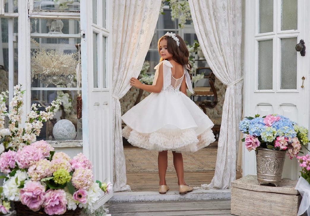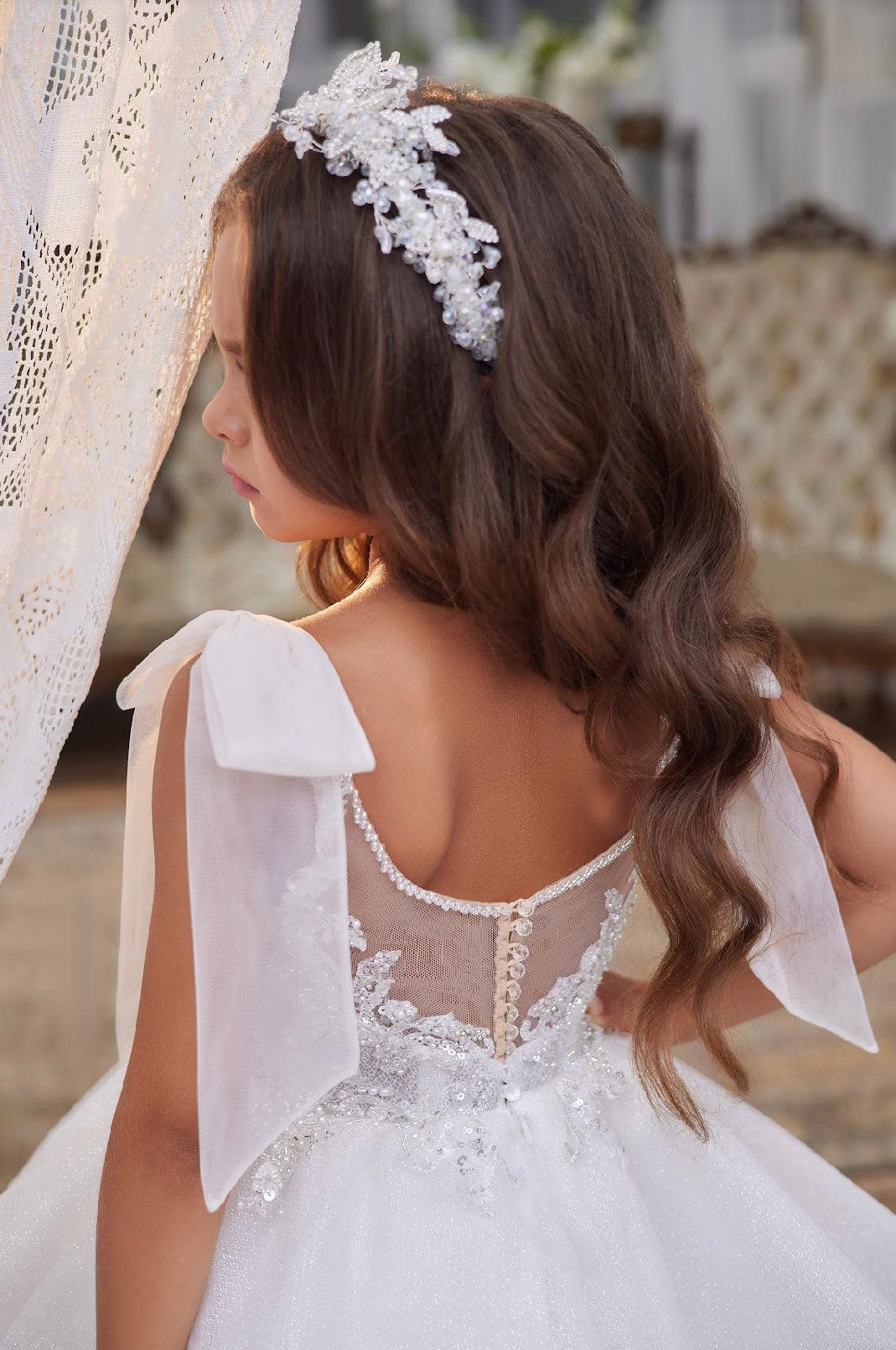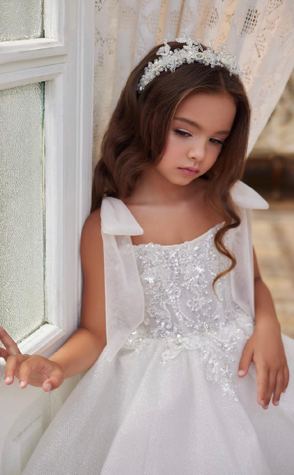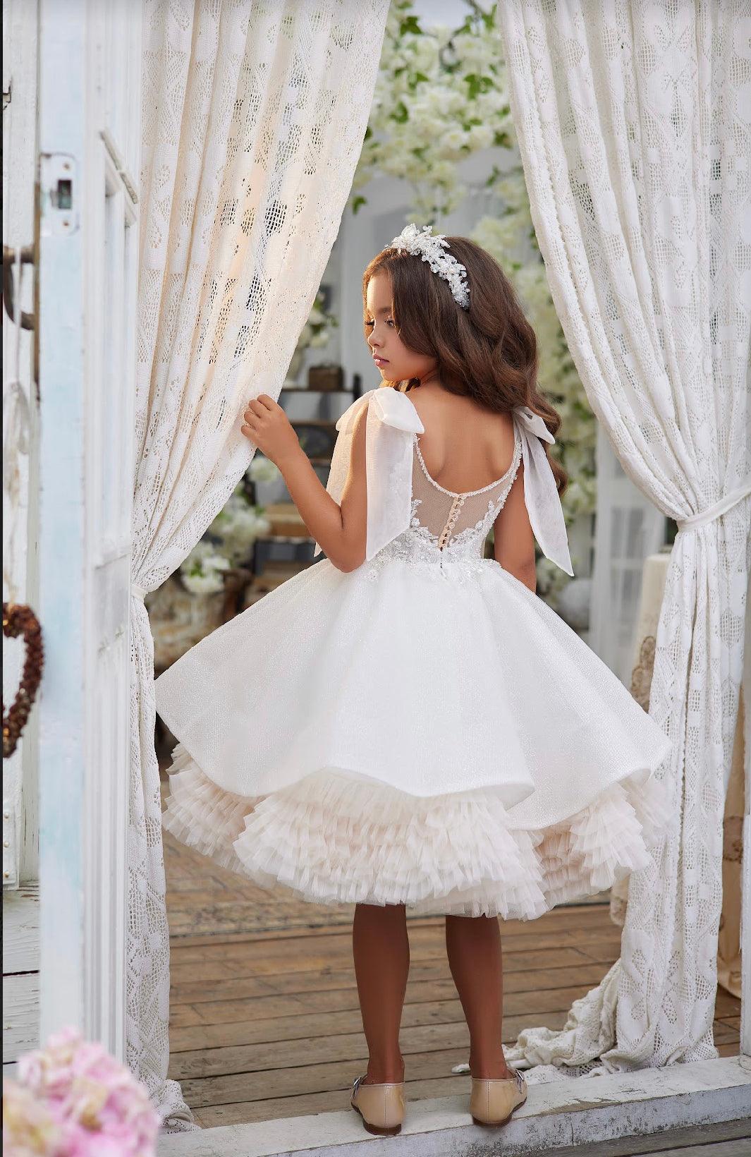 The skirt, made of soft mesh and fully lined, has a shimmery top layer with voluminous ruffles underneath, reaching up to the knees. This design allows for playful twirls and dances. Complement the dress with a tiara or a sparkly headpiece with floral designs.