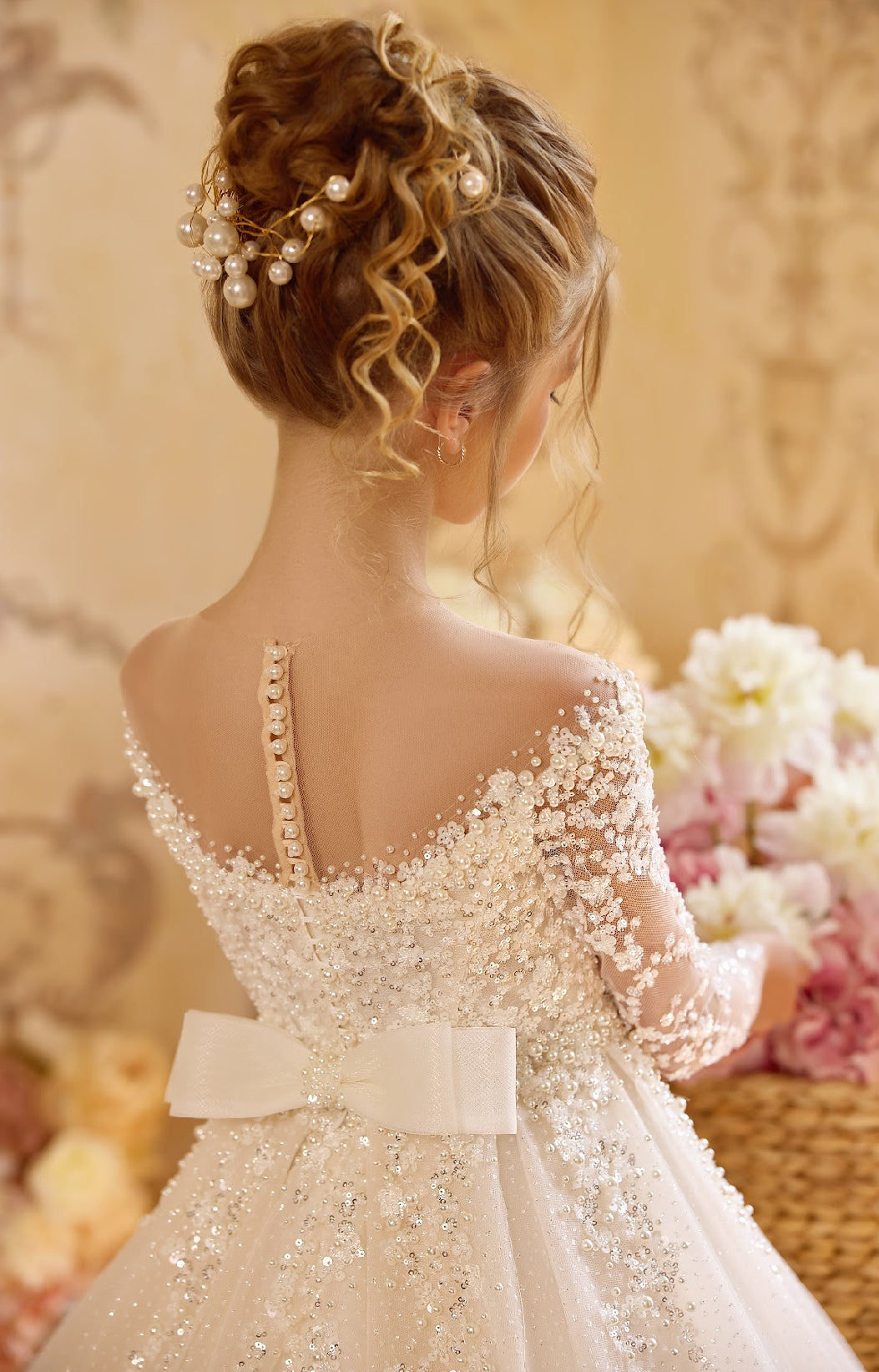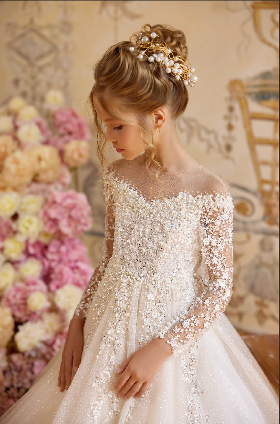 The Pearl Blossom Gown is a masterpiece of elegance, designed to make your little princess shine like royalty.