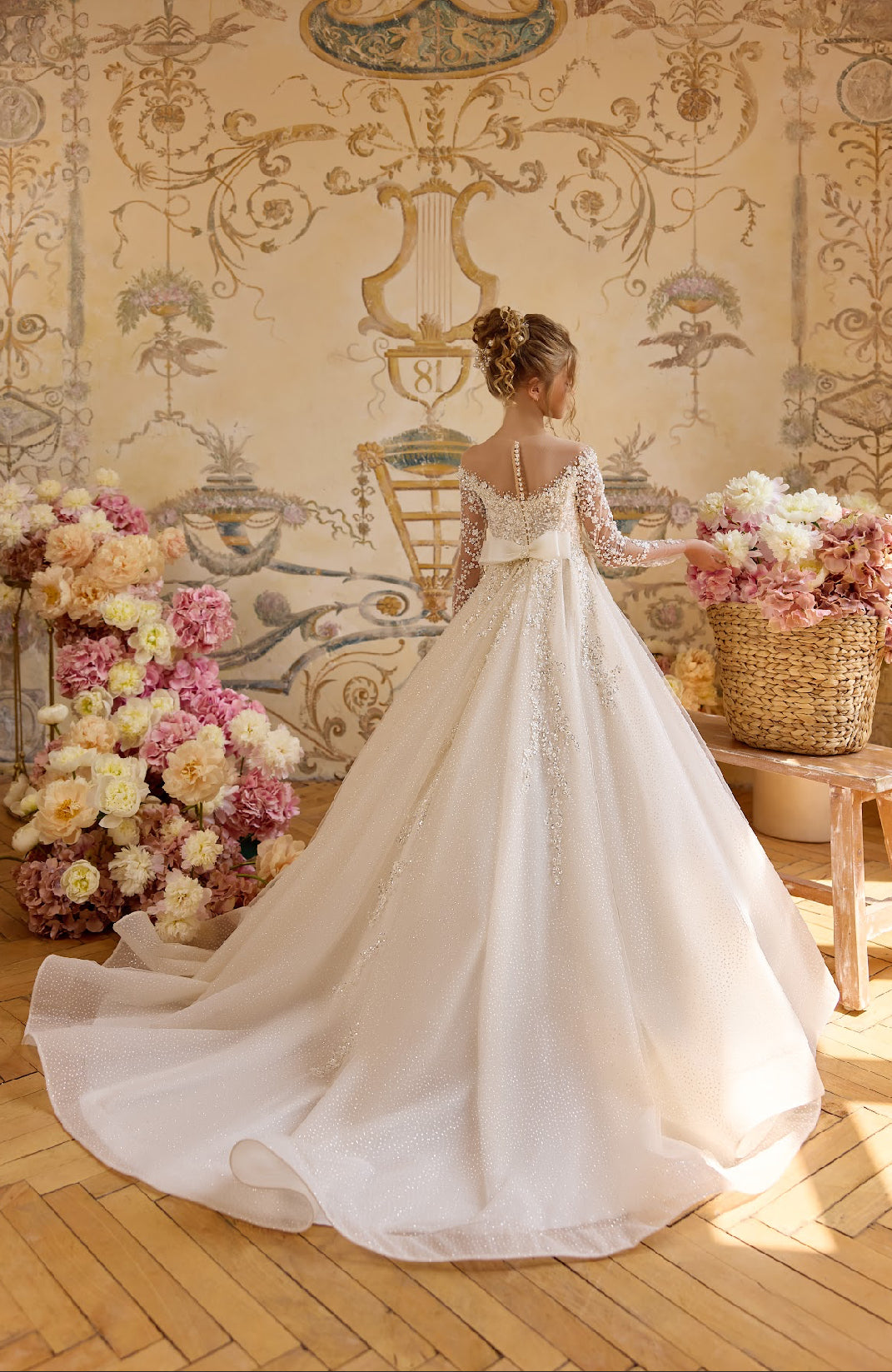 The bodice is adorned with an exquisite garden of hand-applied pearls, sequins, and floral appliqués, cascading seamlessly into sheer illusion sleeves for a delicate yet regal effect. A full ballgown skirt crafted in shimmering tulle flows into a graceful train, dusted with soft sparkle for a truly ethereal glow. The back is finished with a row of pearl buttons and a sweet satin bow, adding the perfect touch of refinement.