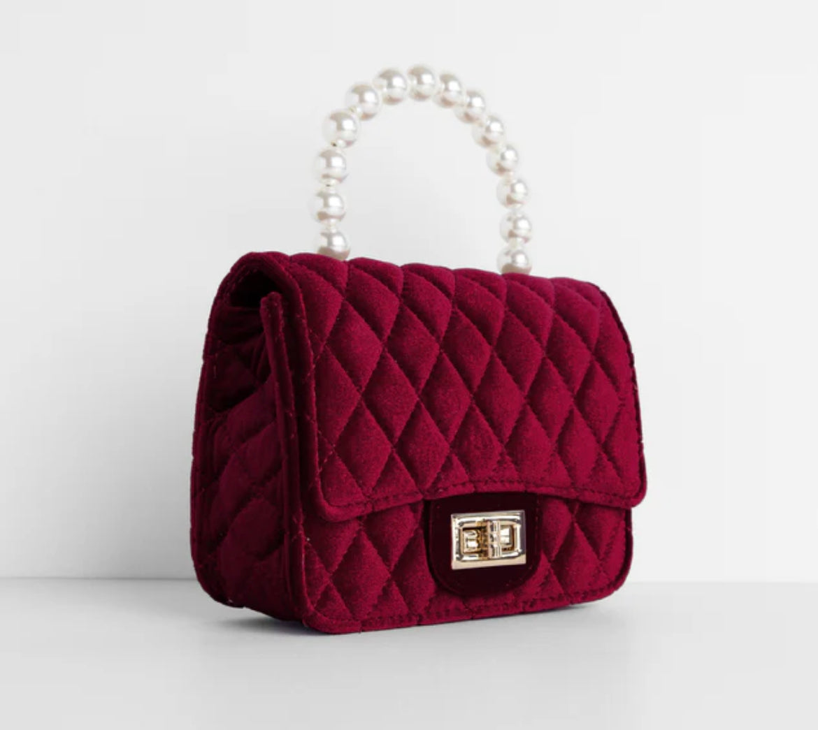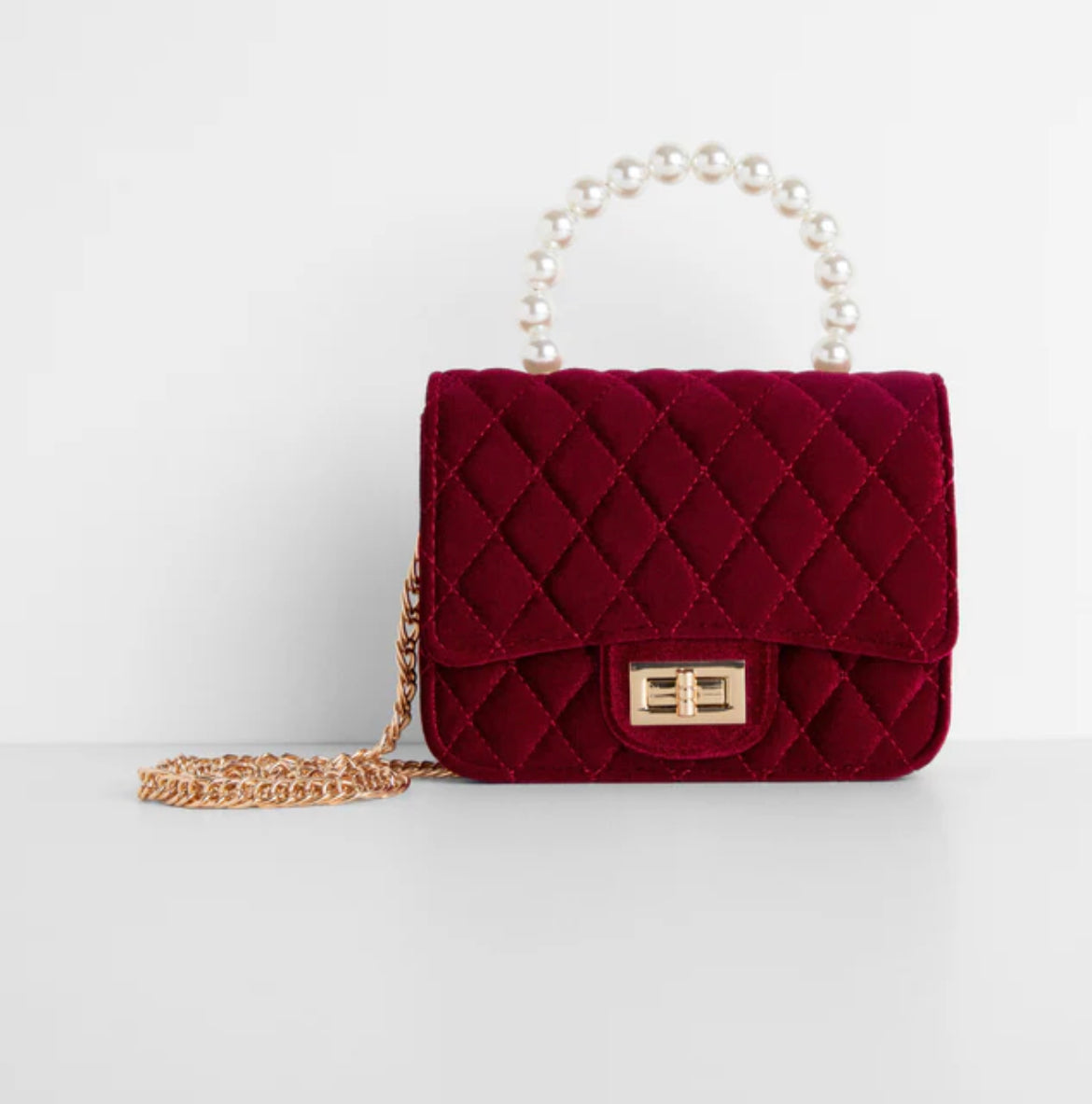 Oh yes you fancy! This mini handbag is designed with a pearl handle, a velvet quilted body, and a golden turn lock closure. Mini purse includes a detachable chain link cross-body strap and an inner zipper pocket.