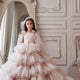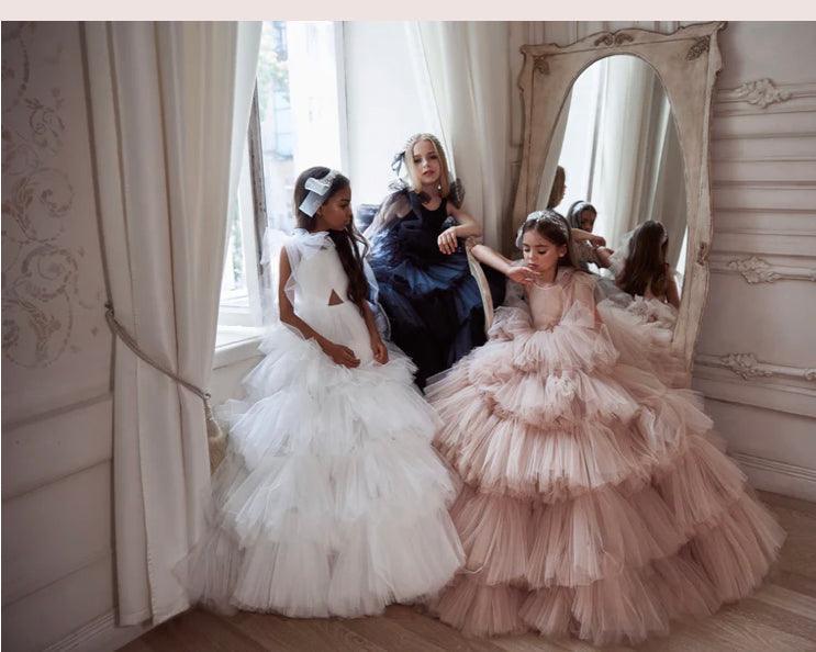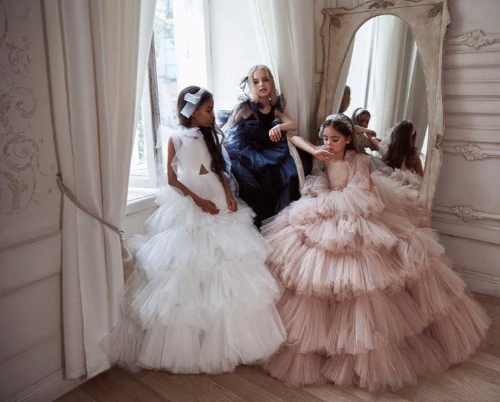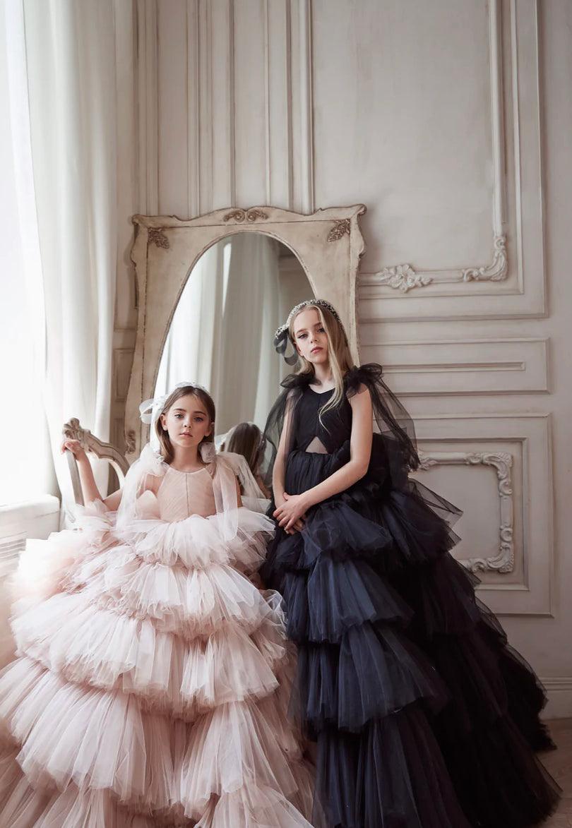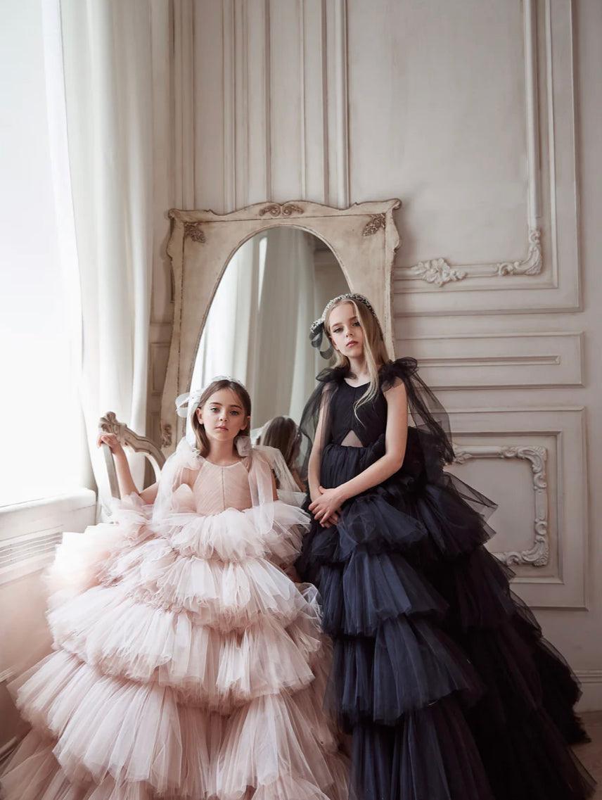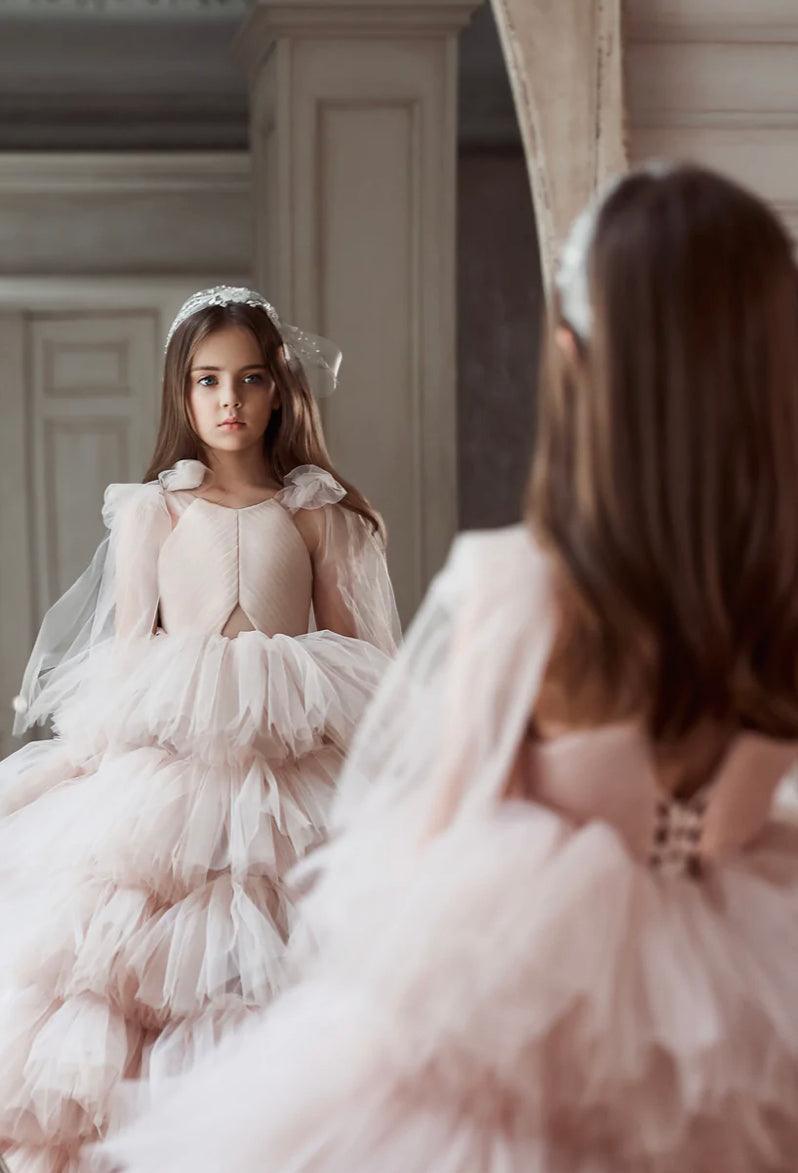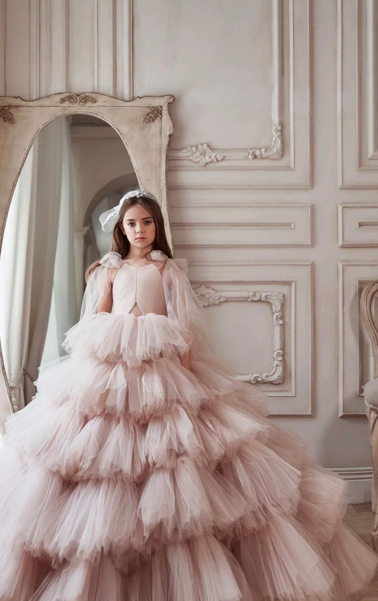 Lovely girls ruffled tulle dress with straps is so adorable! The style features tulle bow-tie straps, a pleated halter-neck top, and a chic corset back. The full multi-tiered skirt has five tiers of ruffles with an extra bottom layer forming a train in the back. Each layer is made of yards of delicate tulle.