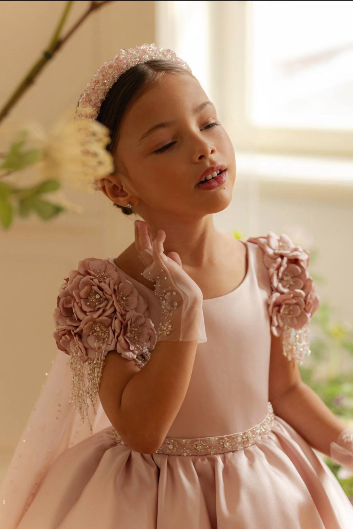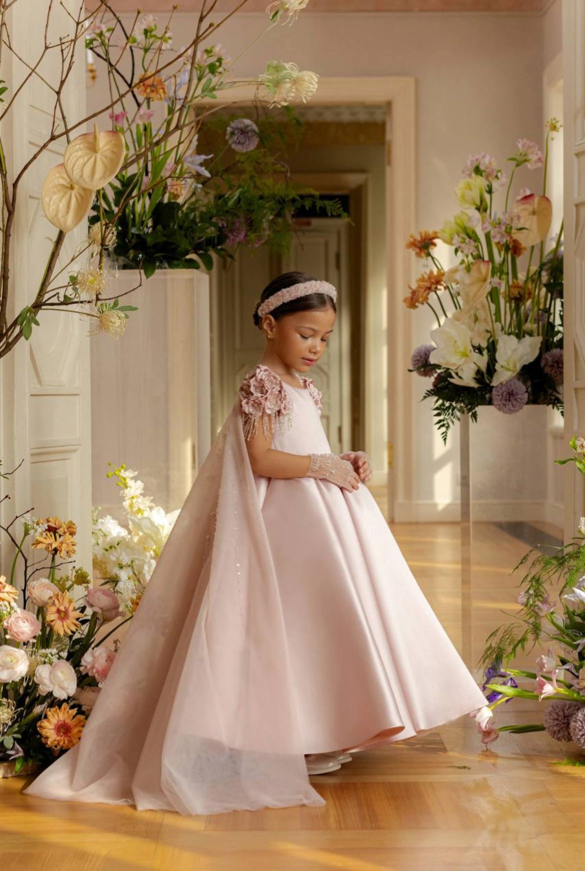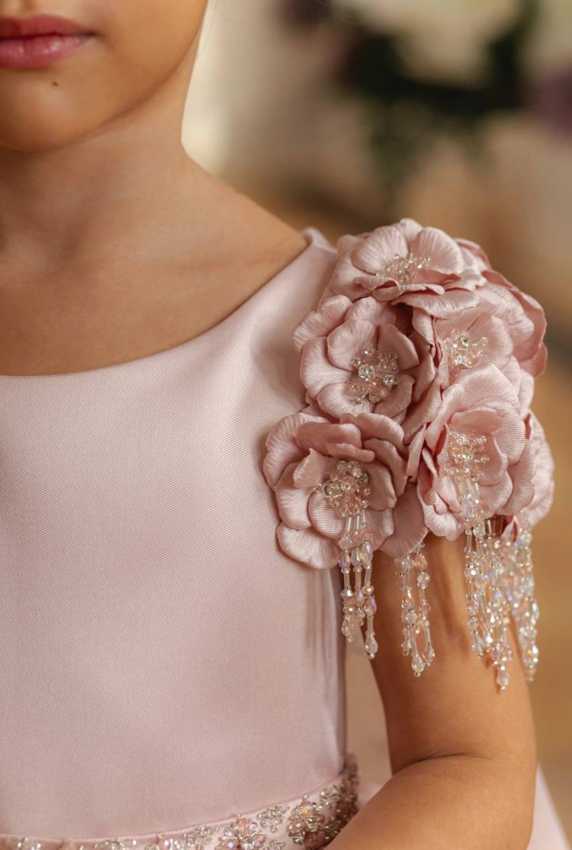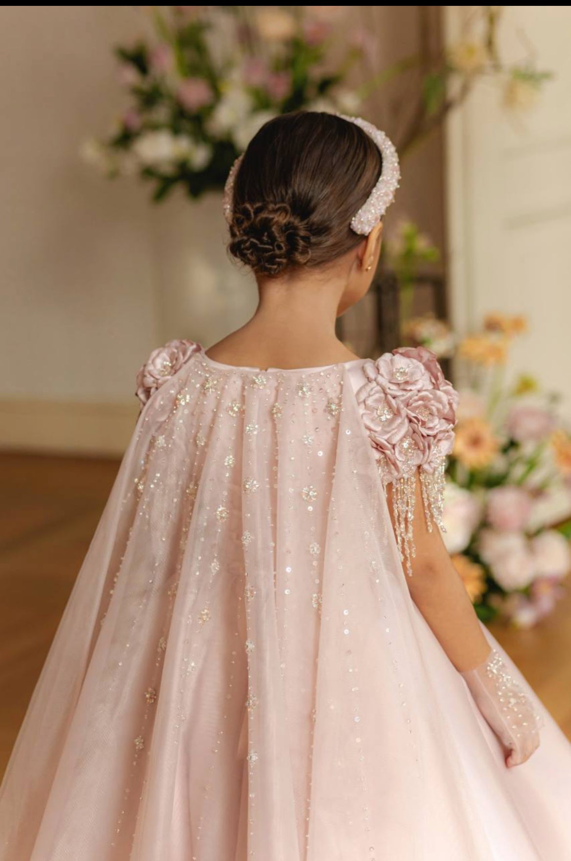 Step into a fairy tale with our Rose Petal Elegance Gown, a breathtaking masterpiece designed for your little princess. This opulent creation showcases intricate 3D floral appliqués, each adorned with shimmering pearls and crystal beadwork cascading over the shoulders for a regal and enchanting touch.