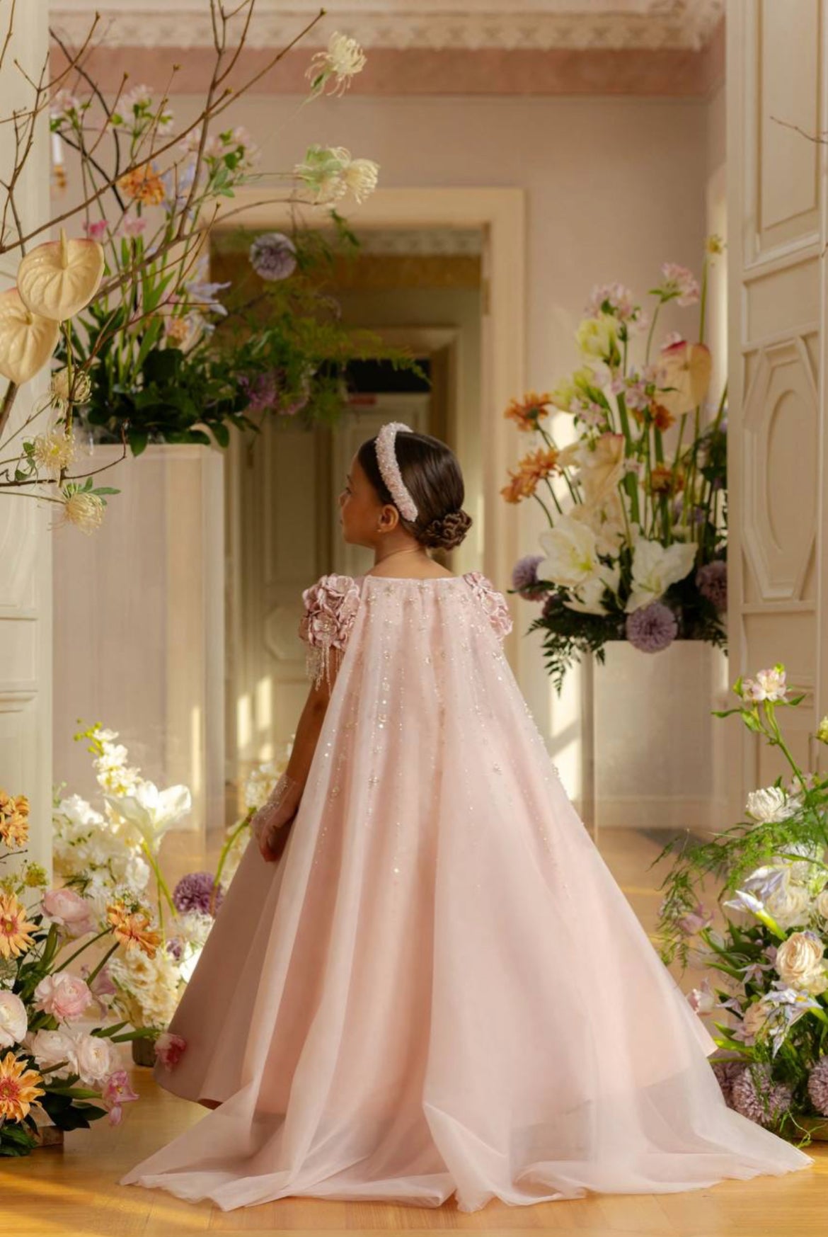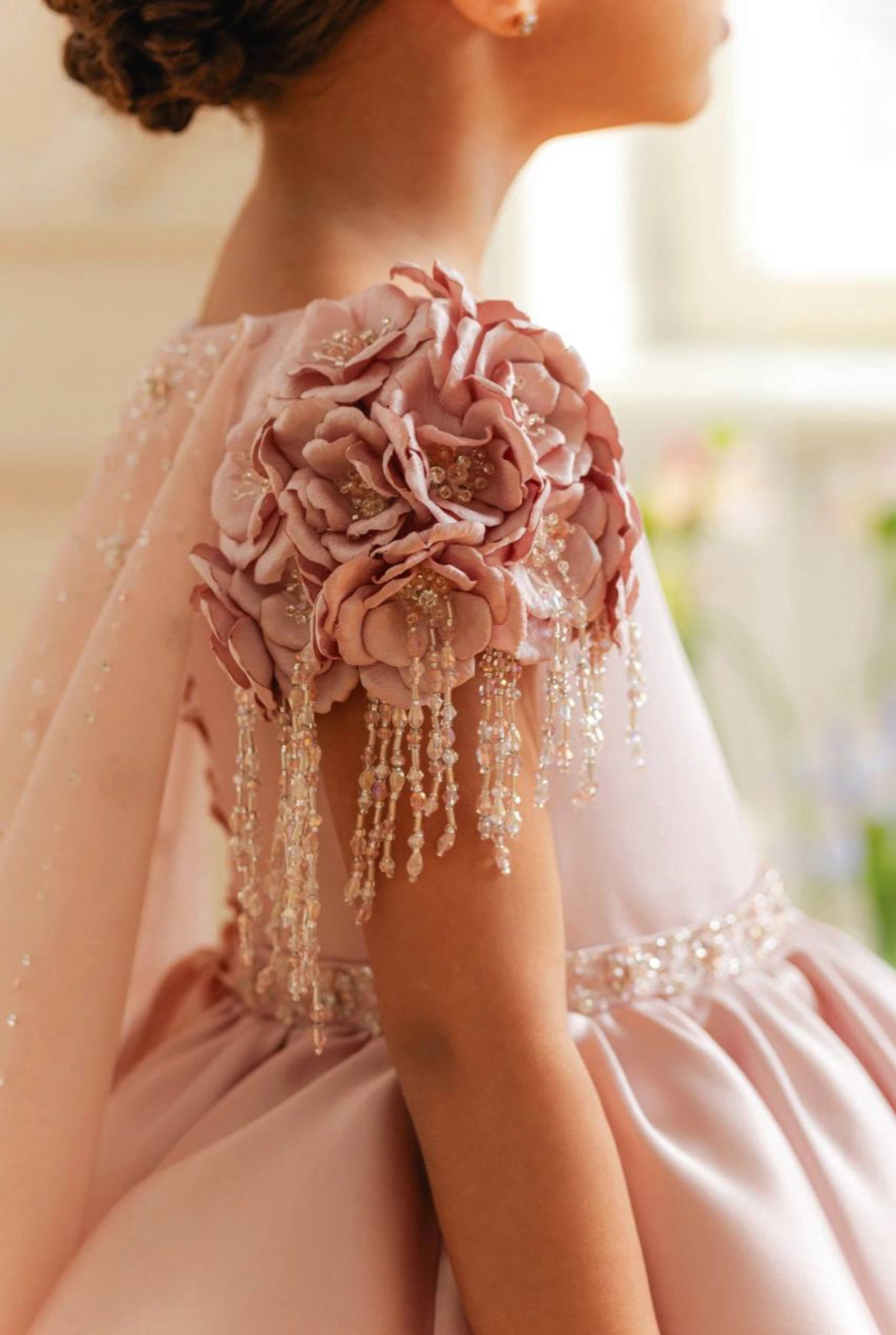 The blush satin gown is layered with a soft, sparkling tulle overlay, creating a dreamy silhouette that flows effortlessly. A detachable, hand-beaded cape drapes elegantly down the back, shimmering with delicate sequins and pearl embellishments, making this gown a true showstopper for weddings, birthdays, and milestone celebrations.