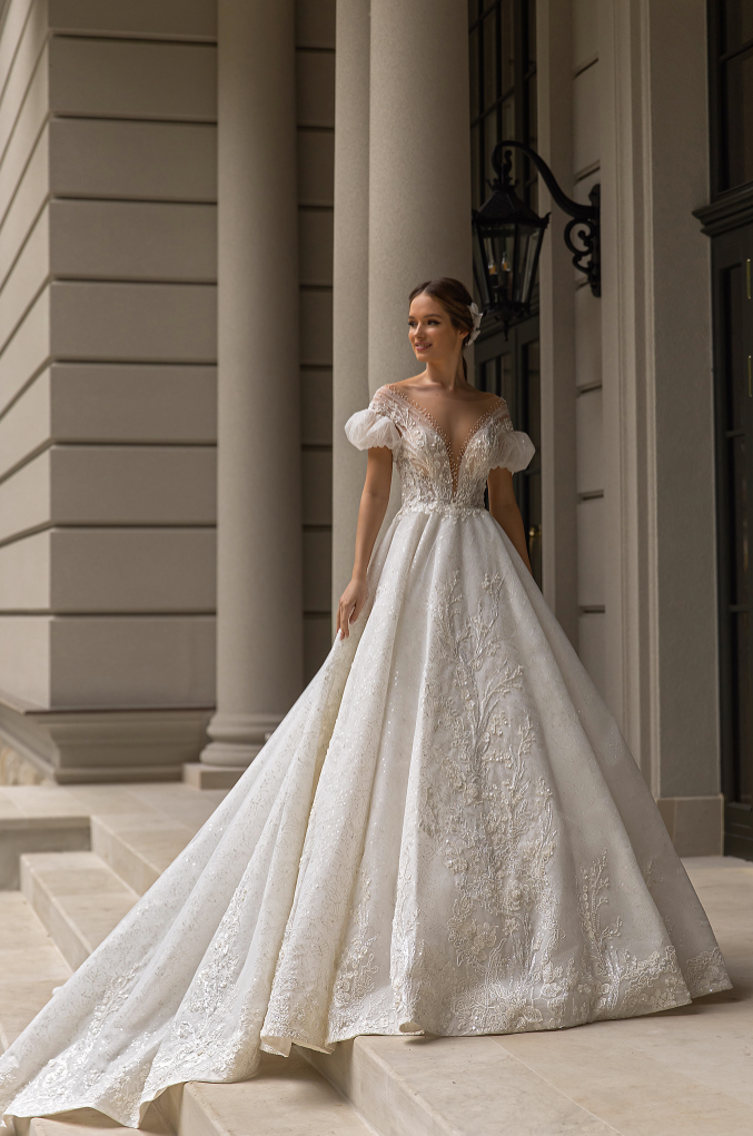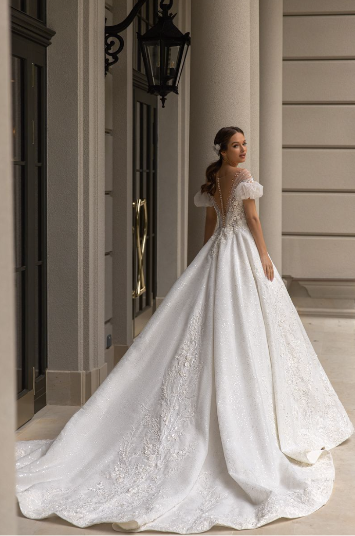 Soft puffed sleeves add a whisper of fairytale charm, while the structured bodice and intricately embroidered cathedral-length train create an unforgettable statement from every angle. A sheer back with pearl-button detailing completes the gown with graceful allure.
