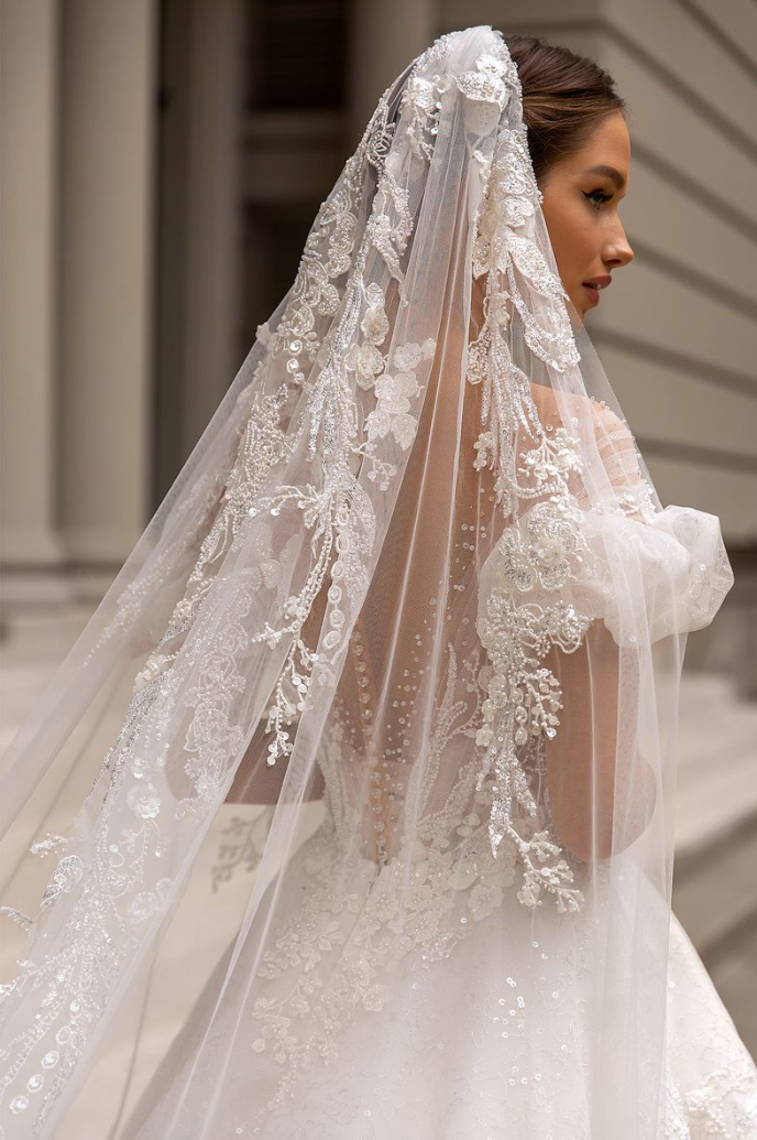 Pair this gown with crystal drop earrings, a sleek low chignon, and a pearl-trimmed cathedral veil for a look that radiates timeless romance. Perfect for stately ceremonies, elegant receptions, or a royal-inspired celebration.