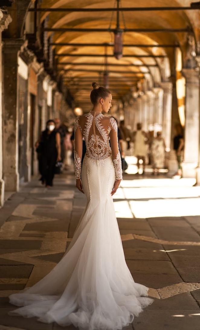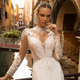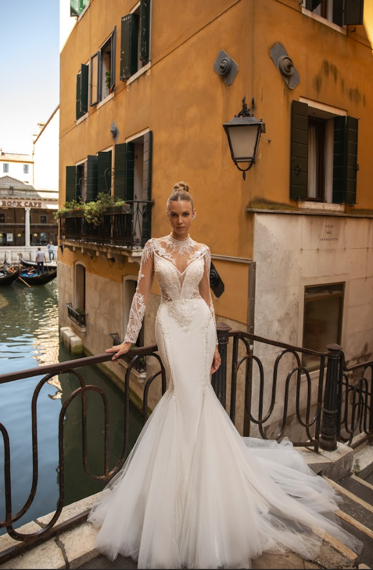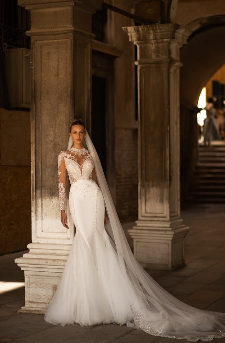 Crafted with opulent beadwork and exquisite embroidery, the Alveria features a high illusion neckline with dramatic floral embellishments that cascade over the décolletage and shoulders. The daring plunge illusion bodice, coupled with intricate long lace sleeves, evokes power and femininity in perfect harmony.