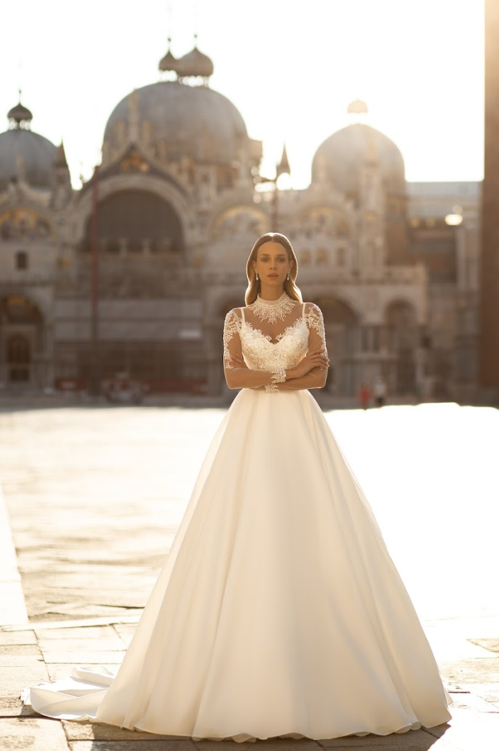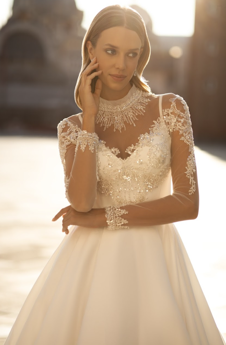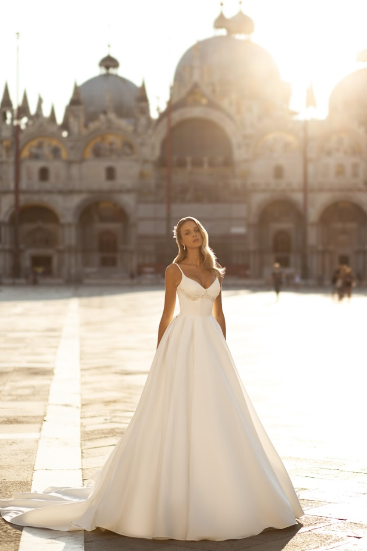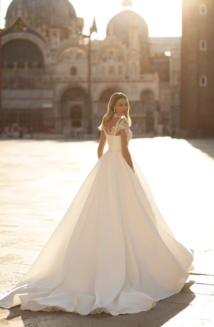 A celebration of regal refinement and graceful romance, the Avanthia Gown is the epitome of timeless bridal splendor. Designed for the bride who dreams of a royal walk down the aisle, this luxurious A-line silhouette features a full satin skirt that flows into a sweeping cathedral train, exuding opulence with every step.
