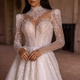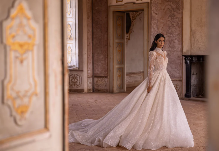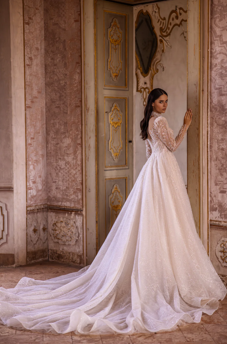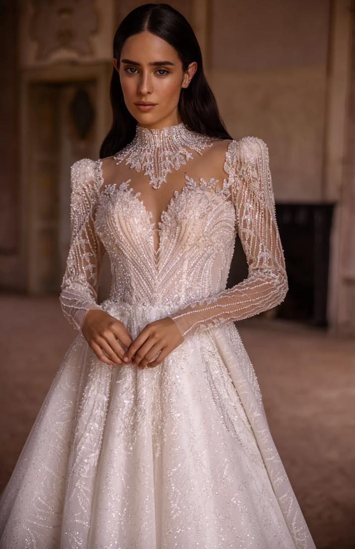 Breathtakingly regal and dripping in opulence, the Celina Gown is crafted for the bride who dreams of timeless elegance with a dramatic flair. Exquisitely adorned from neckline to hem, this gown features a luxurious illusion neckline embellished with sparkling beads, intricate lace appliqués, and delicate embroidery cascading down the sleeves and bodice, creating a mesmerizing play of shimmer and texture. The sheer, long sleeves detailed with intricate beading and embroidery exude sophistication, while the enchanting open back accented with crystal buttons adds a captivating touch of glamour.