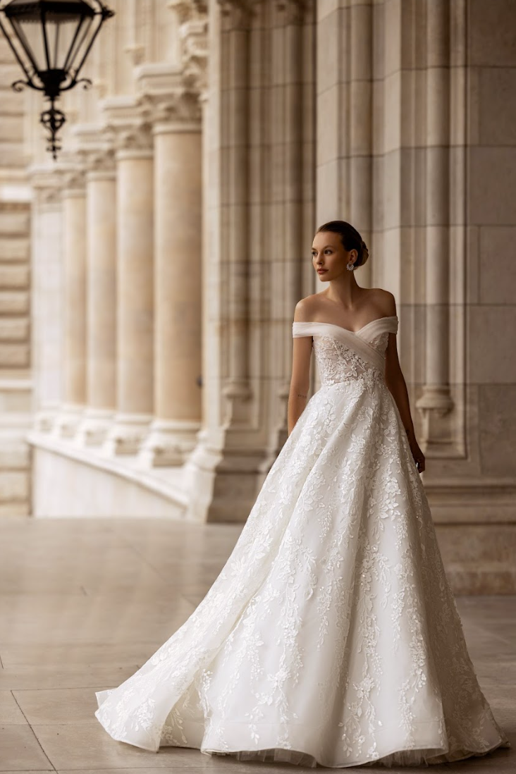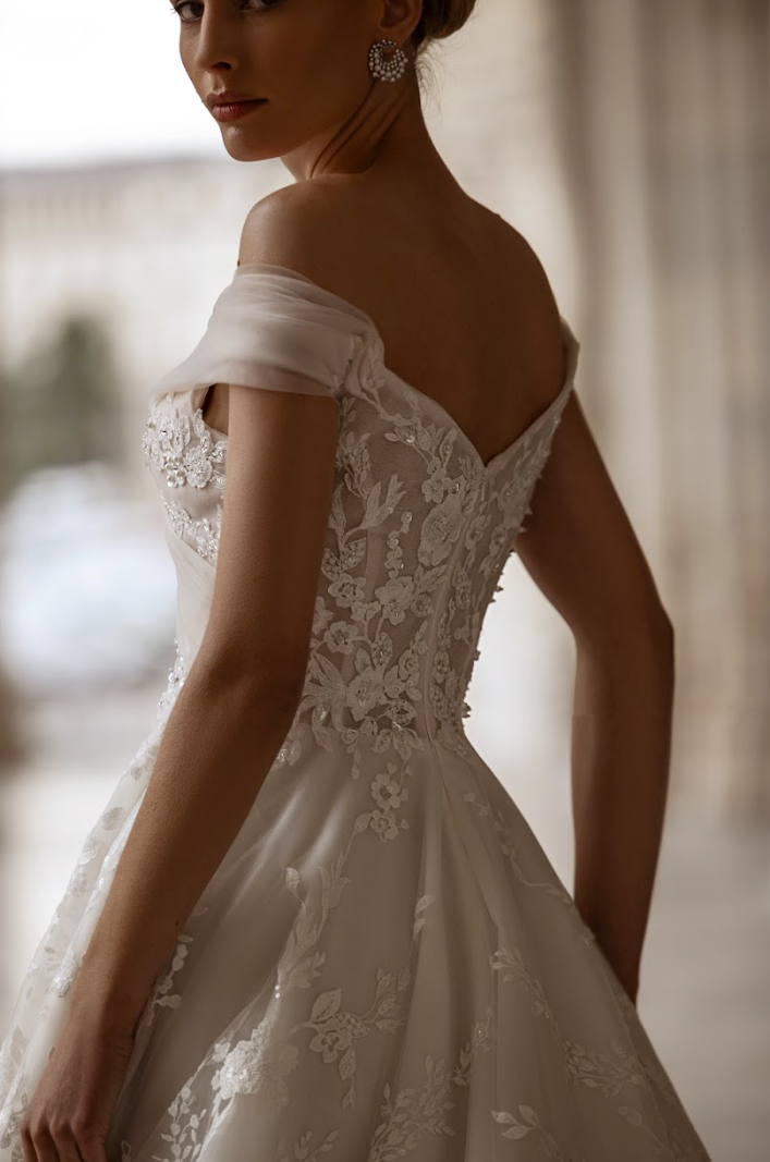 Graceful. Regal. Eternally romantic. The Elowen Gown is a breathtaking ode to timeless femininity and floral opulence. Crafted in soft ivory lace with a cascading A-line silhouette, this gown features delicate off-the-shoulder draping that melts seamlessly into a sculpted corset bodice adorned with botanical embroidery and shimmering floral appliqué.
