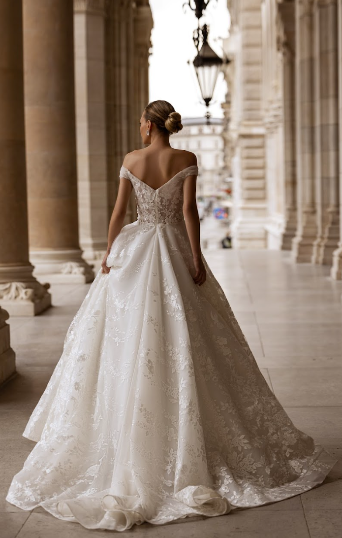 The intricate lace detailing continues through the voluminous skirt, creating a soft ethereal movement with every step. A subtle plunge at the neckline adds modern allure, while the structured bodice ensures the perfect fit for a statuesque bridal silhouette. The illusion back and delicate button detailing provide a hint of vintage charm, while the sweeping train completes the look with dramatic elegance.