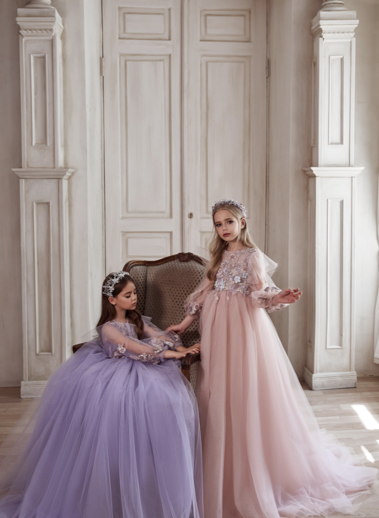 Where imagination meets artistry, the Enchanted Garden Gowns bloom in two ethereal hues—soft blush and dreamy lavender. Each gown is adorned with hand-sewn floral appliqués, delicate sequins, and crystal embellishments that shimmer like morning dew. The sheer tulle sleeves float effortlessly, while the full layered skirt captures the magic of movement. Designed to make every little princess feel like she stepped straight from a fairytale.