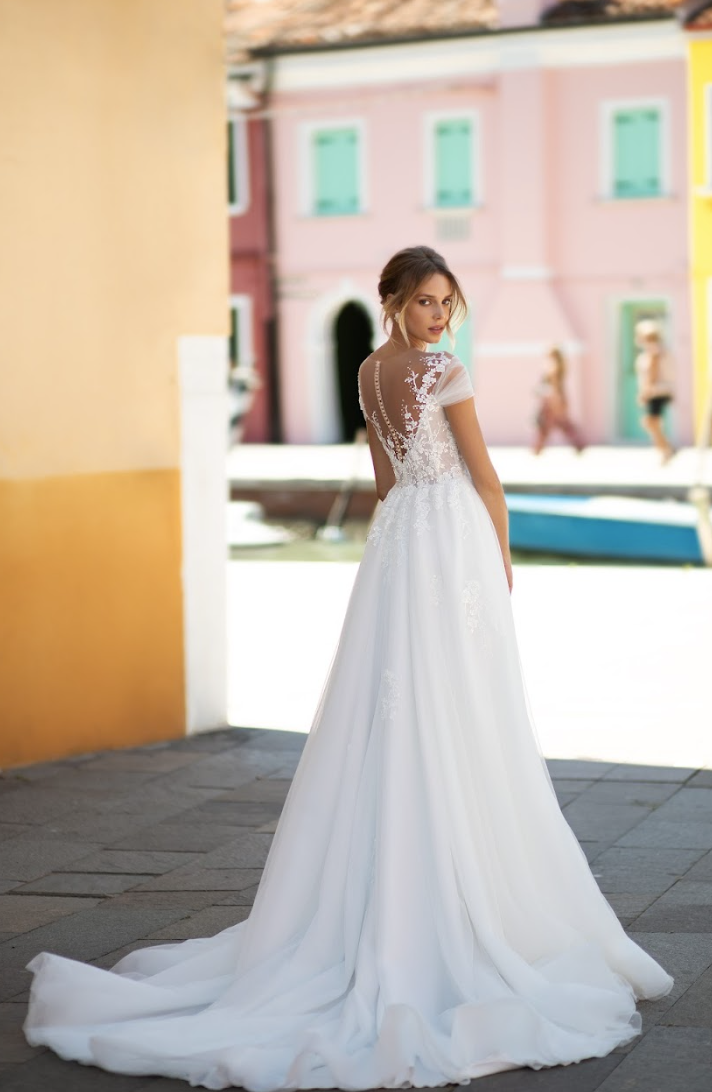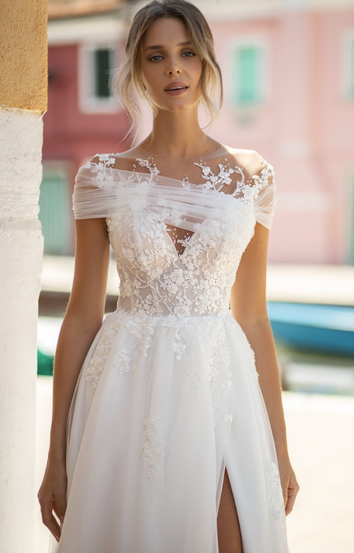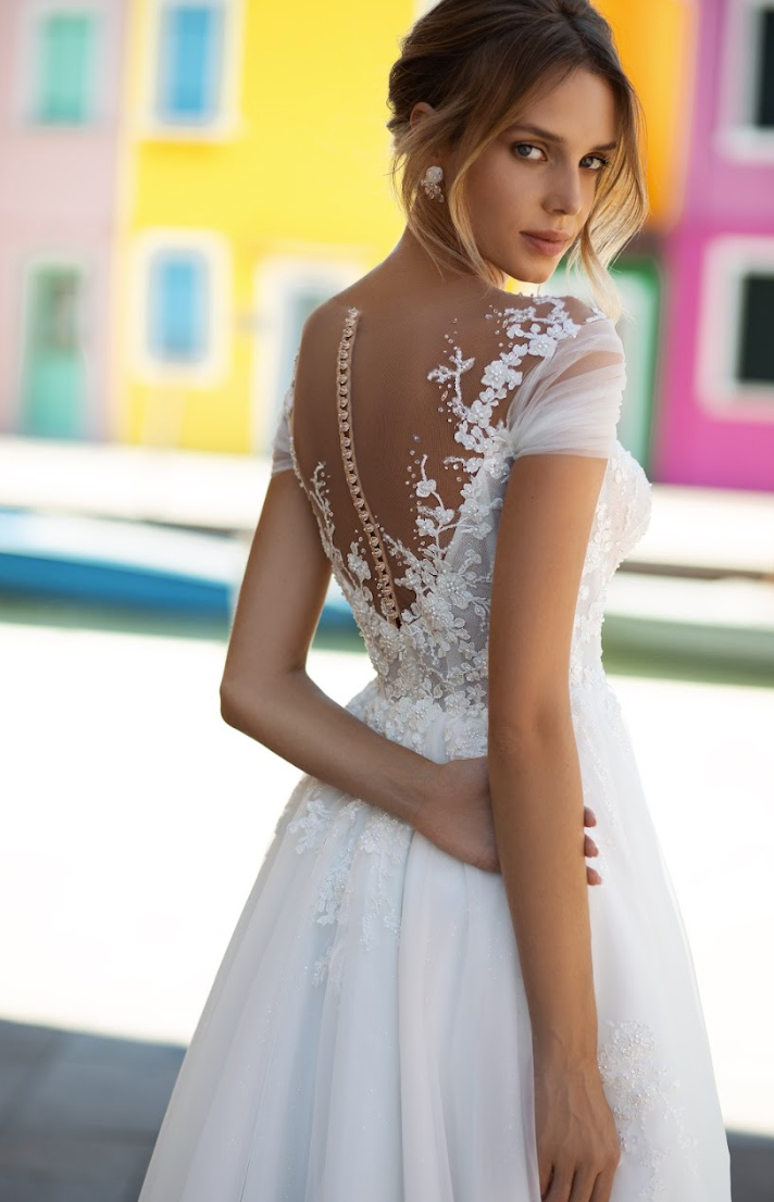 A whisper of modern romance and ethereal elegance, The Evalisse Gown is designed for the bride who dares to embrace softness with an edge. This breathtaking A-line silhouette features a delicately ruched illusion bodice adorned with intricate floral appliqués that seem to bloom effortlessly across the sheer neckline and cap sleeves. A subtle sweetheart underlay peeks through beneath the illusion tulle, adding dimension and grace.