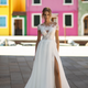 A daring thigh-high slit adds a modern, confident allure to the otherwise fairytale-like skirt, flowing gracefully into a full sweeping train made of layers of soft chiffon and tulle. The back stuns with an illusion floral applique panel and delicate covered buttons that trail down the spine, ensuring the bride makes a grand impression from every angle.