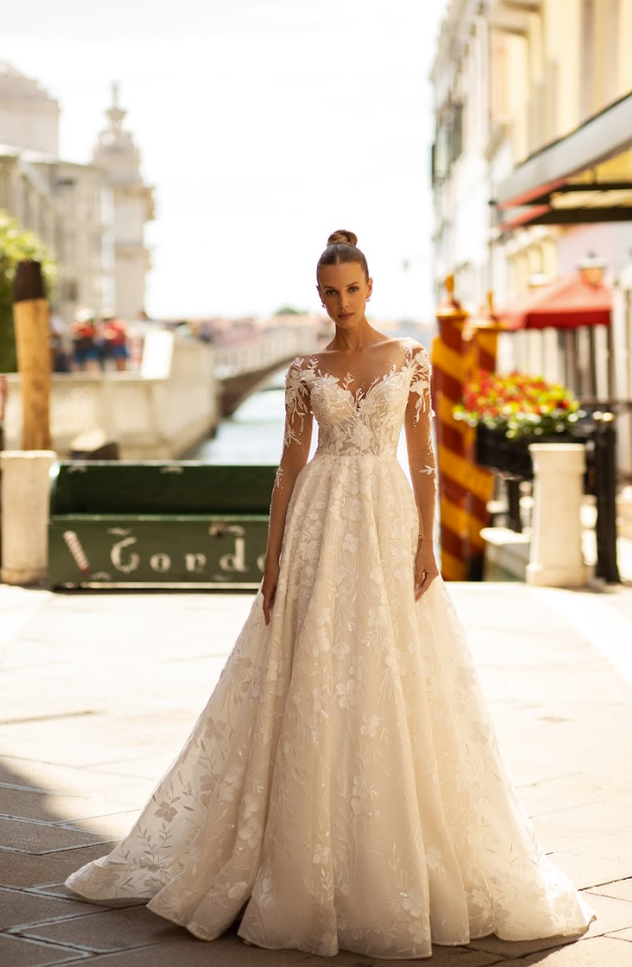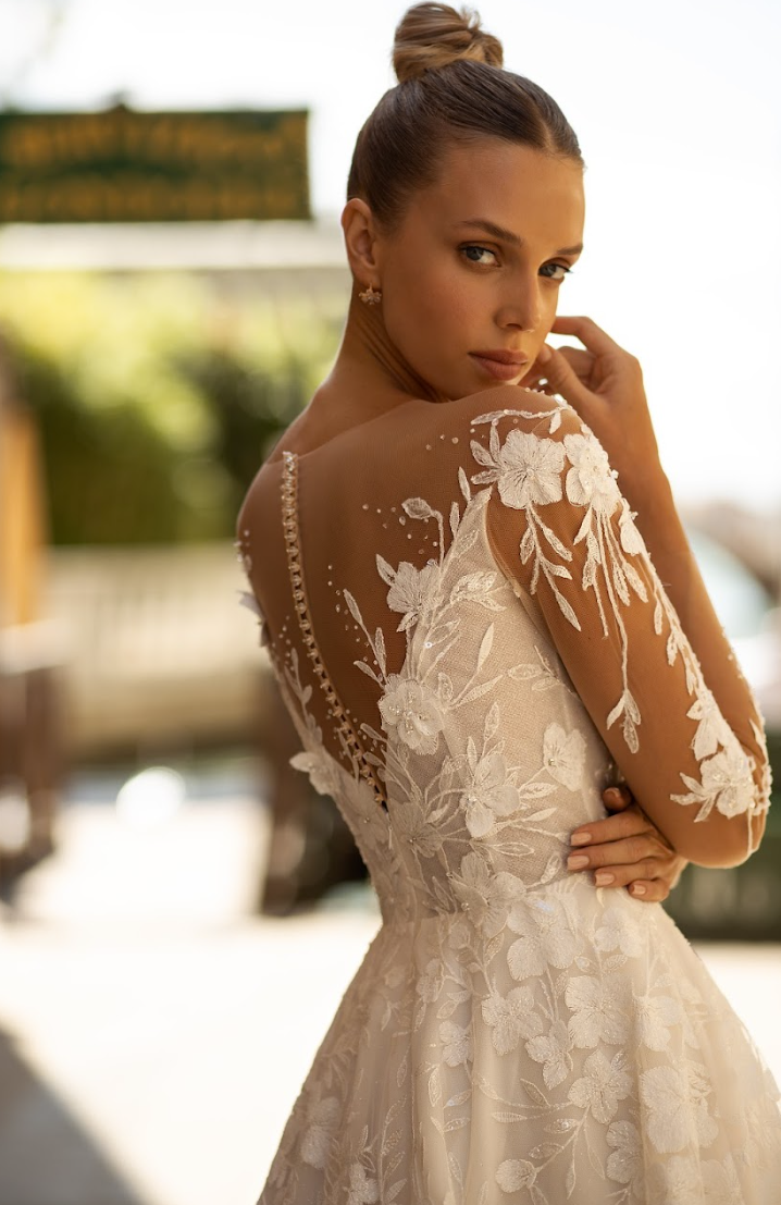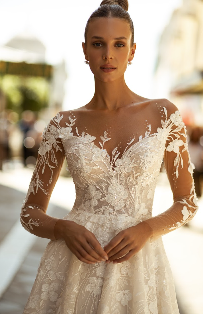 The illusion neckline and sheer long sleeves are exquisitely detailed with hand-placed lace appliqués, creating a breathtaking vine-like pattern that cascades down the bodice and onto the skirt. The soft nude lining beneath adds a hint of dimension, allowing the floral motifs to subtly bloom across the gown.