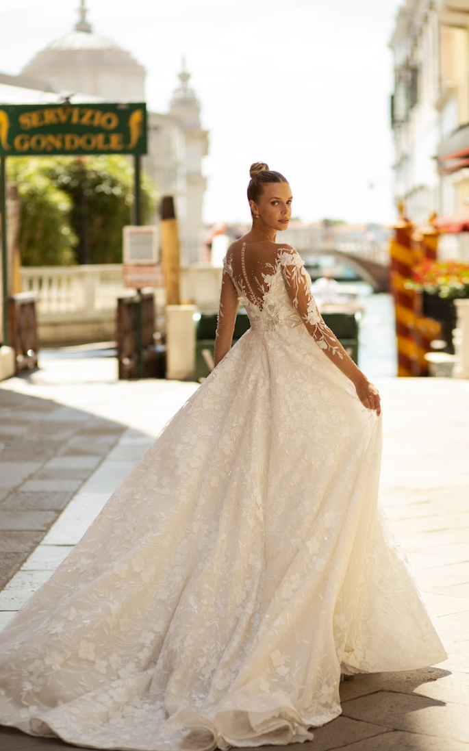 A dramatic yet graceful train trails behind, completing the look with grandeur. The back features a row of dainty buttons, adding a final touch of classic sophistication.