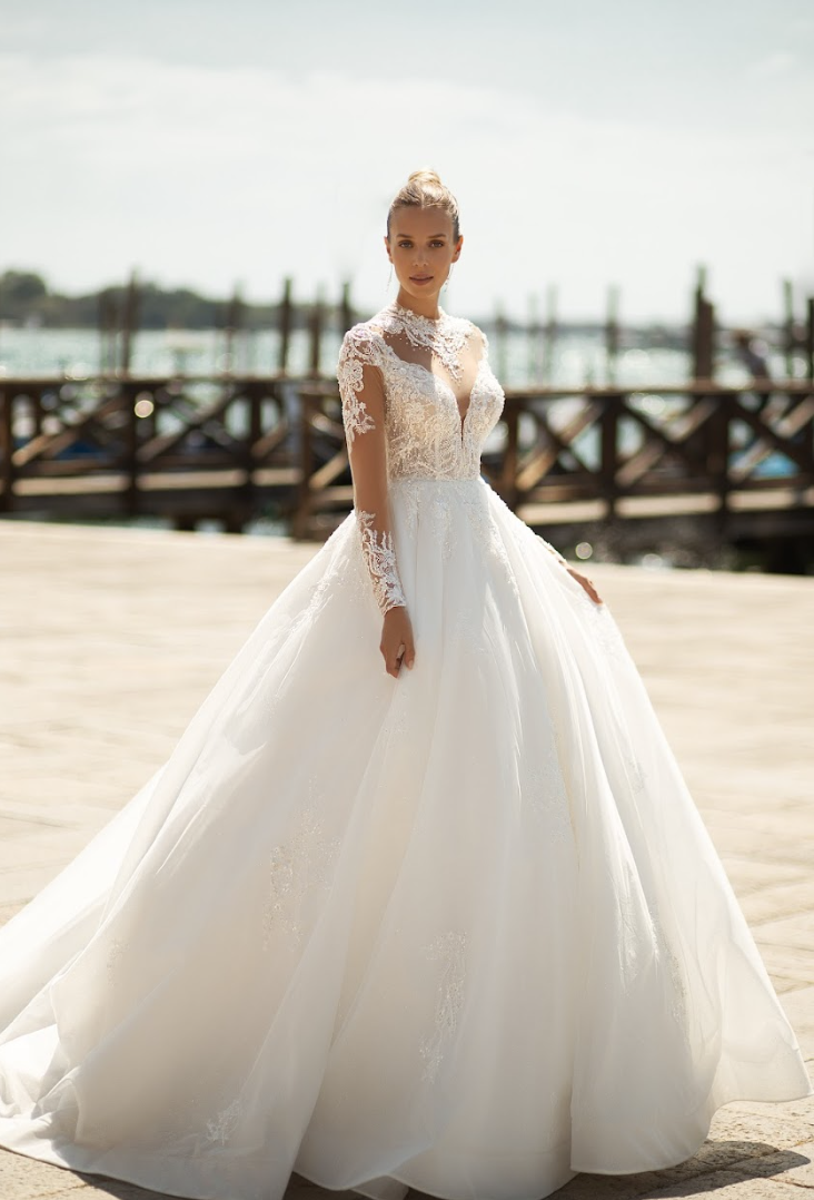 Radiating the golden glow of timeless elegance, The Orielle Gown is a breathtaking celebration of romance and refinement. This regal ball gown features a sculpted illusion neckline adorned with intricate embroidery and hand-placed lace appliqués that cascade gracefully over the bodice and sleeves. The high illusion collar adds a touch of vintage sophistication, while the sheer back design, finished with delicate button detailing, offers an alluring glimpse of modern glamour.