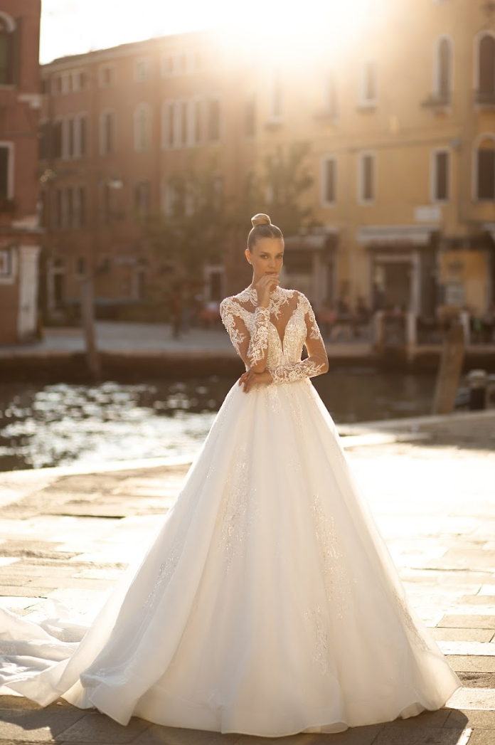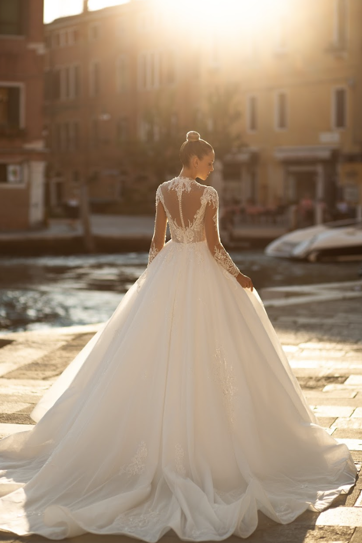 Style Inspiration: Pair this gown with a cathedral-length veil, vintage drop earrings, and a sleek low chignon to complete the look of timeless sophistication. Perfect for a grand cathedral ceremony, European château wedding, or a candlelit evening affair.