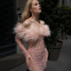 The defining feature is its dramatic off-shoulder feathered neckline—lush, airy plumes in a soft pastel pink that frame the décolletage with exquisite texture. The sculpted bodice features subtle boning for support, while the long embellished sleeves add a balance of elegance to the playful, high-impact silhouette.