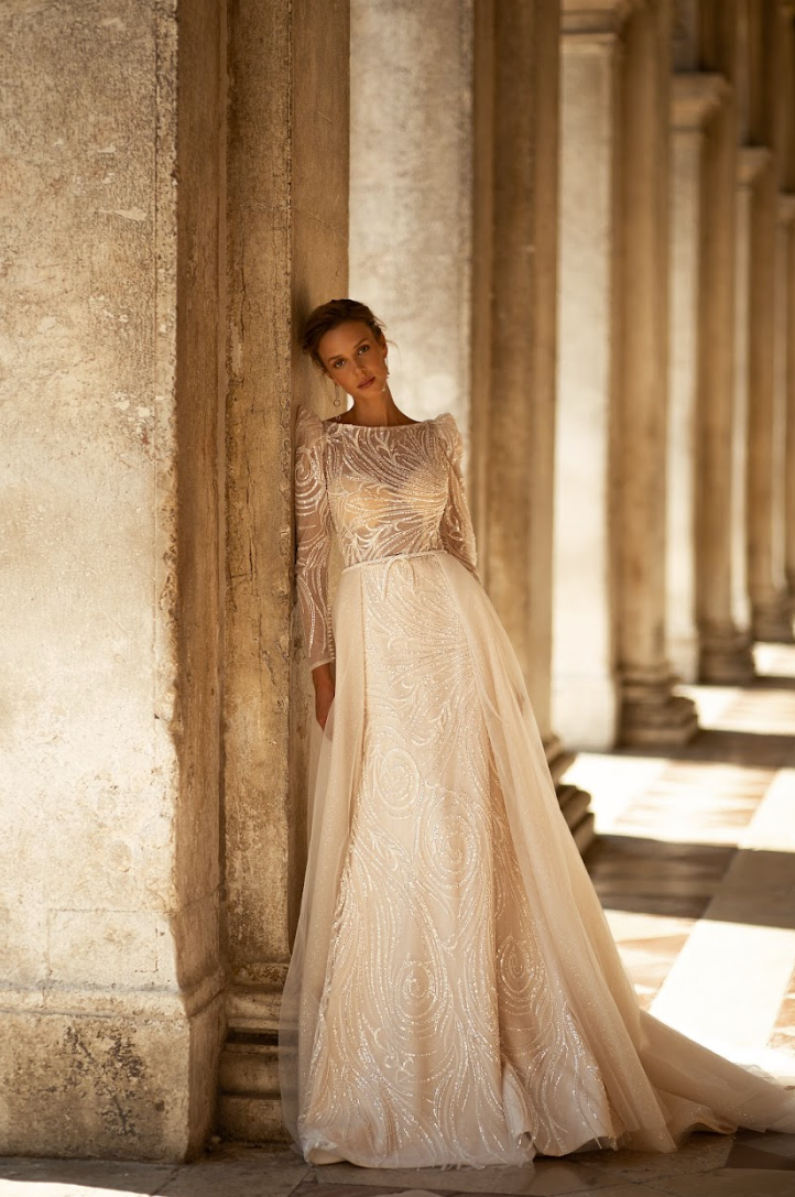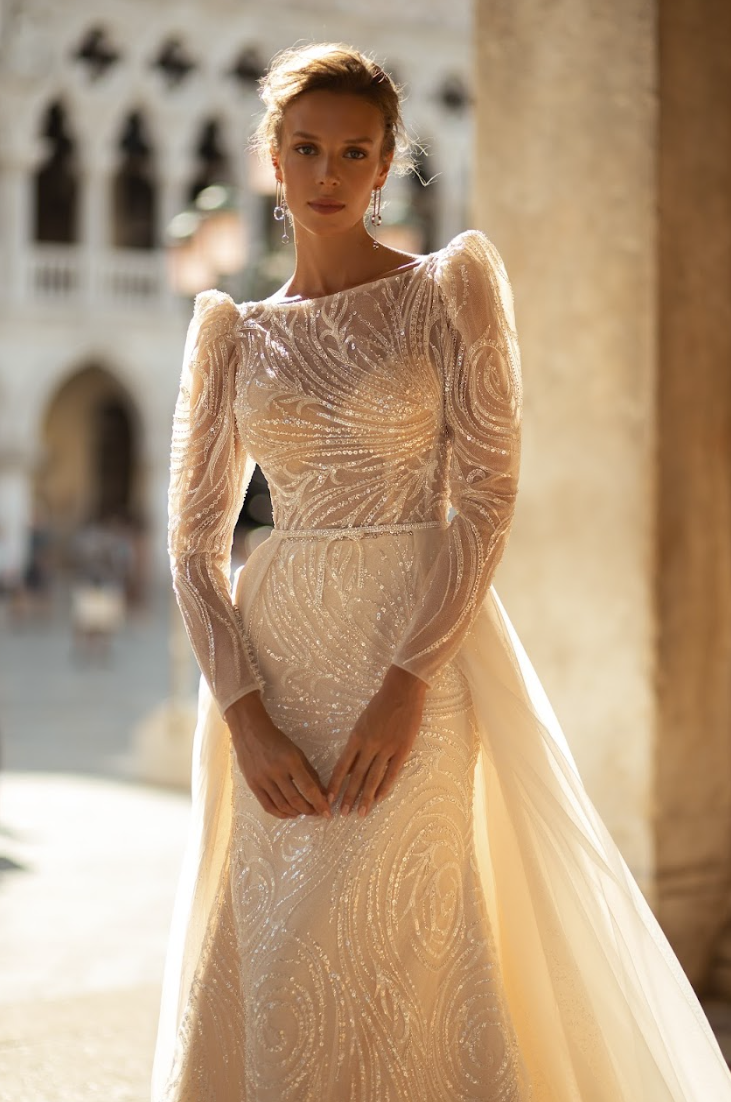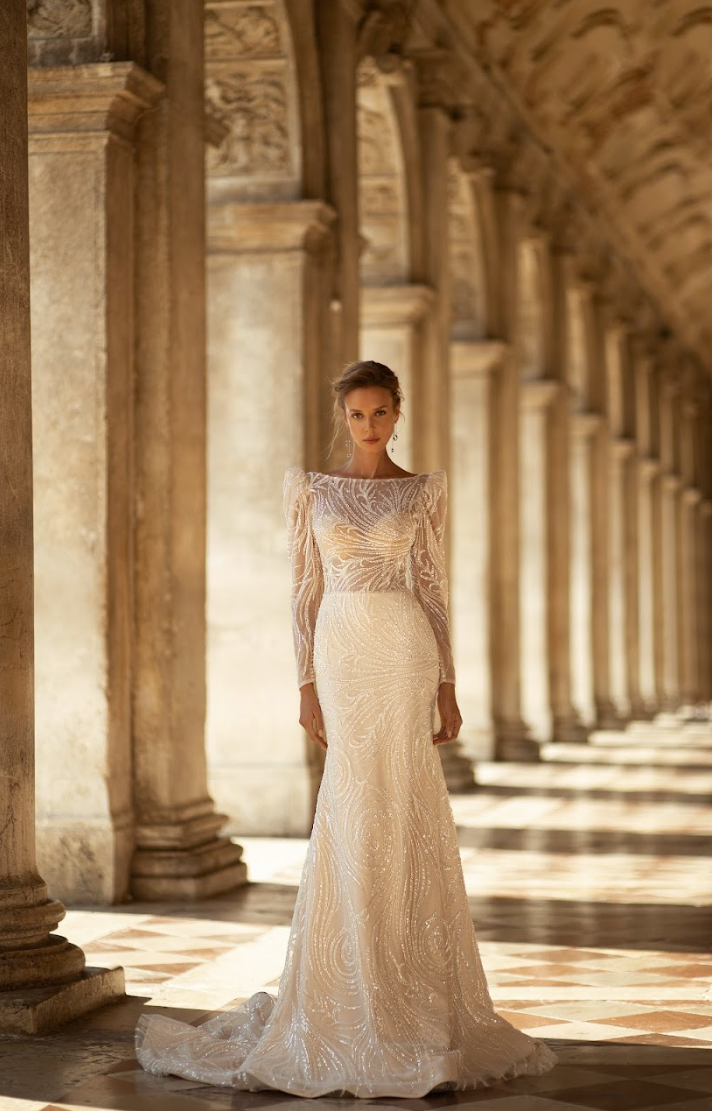 A true embodiment of modern regality, the Solene Gown captivates with its sculpted silhouette and ethereal shimmer. This masterfully crafted piece features a striking illusion bateau neckline and long sheer sleeves, adorned with intricate beadwork and swirling patterns of sequins that glisten with every movement. The fitted bodice gracefully melts into a structured sheath skirt, highlighting your form before cascading into a soft chapel train.