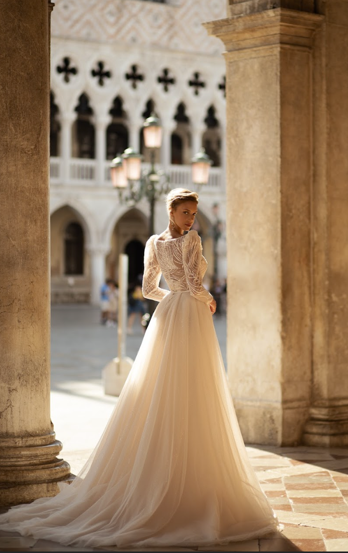 What sets Solene apart is its detachable overskirt—crafted from layers of airy tulle that add a voluminous, romantic touch for the ceremony, then effortlessly removed to reveal a sleek, red-carpet-ready look for the reception. The back detail stuns with its delicate buttons and sheer design, offering a graceful finish from every angle.