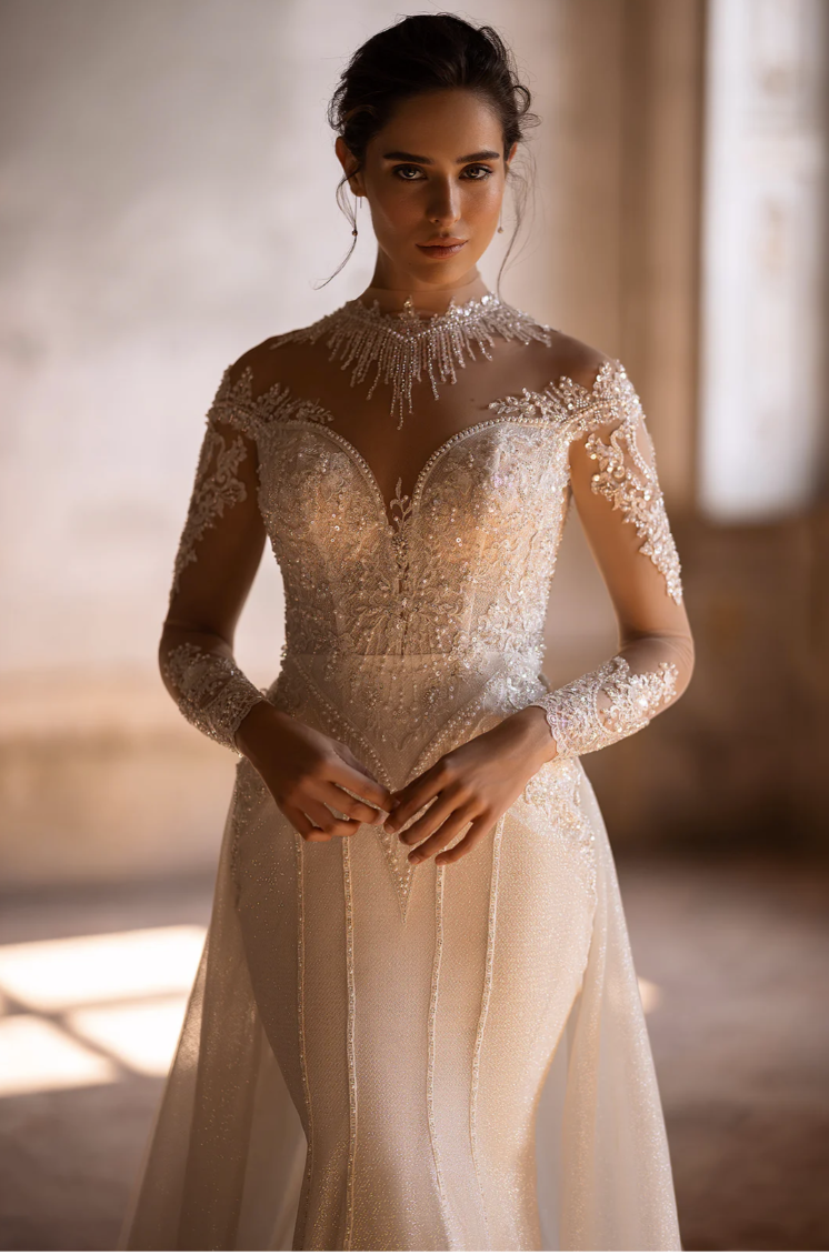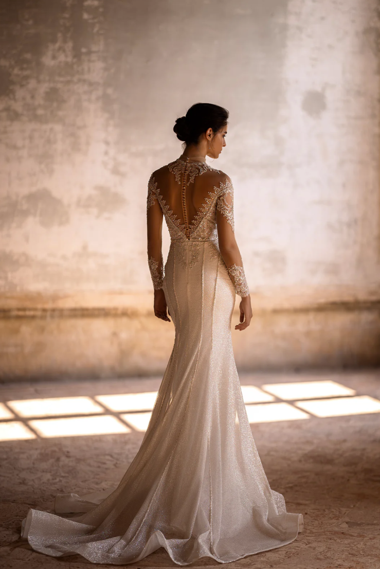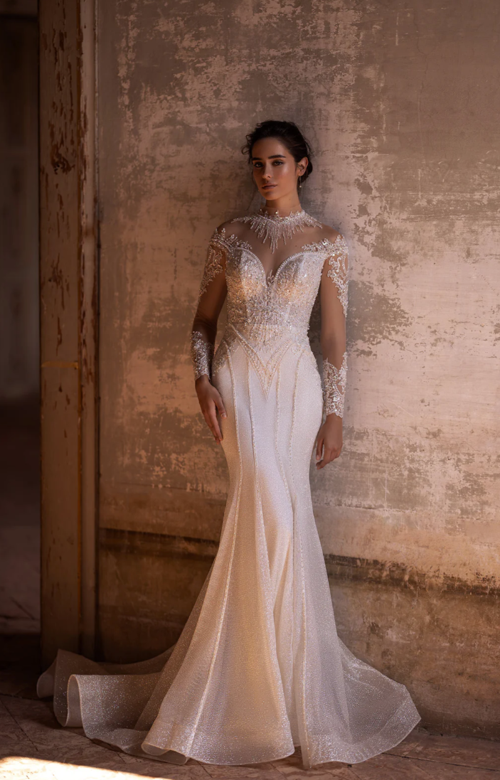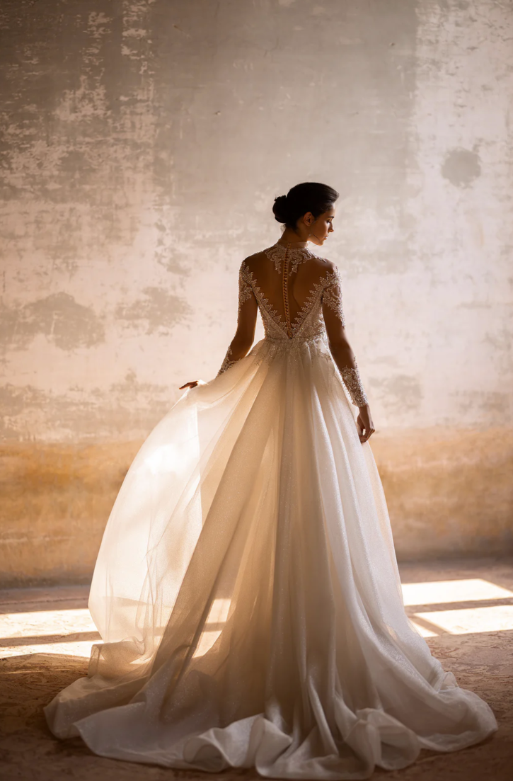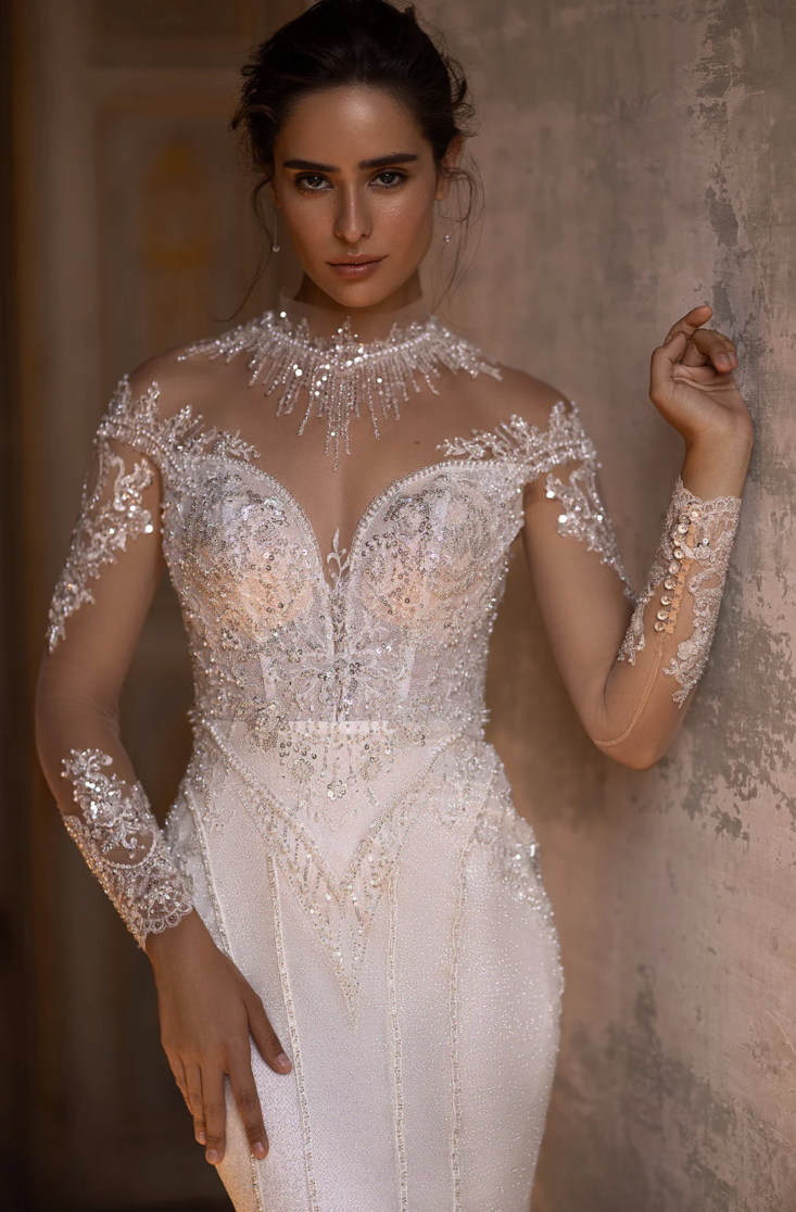 Step into your fairytale moment with the enchanting Valeria Gown, a breathtaking vision of sophisticated elegance and timeless romance. Meticulously crafted, this gown features an illusion sweetheart neckline that gracefully flows into intricate lace sleeves adorned with shimmering crystal accents, capturing light with every delicate movement. The fitted silhouette, embellished with lavish beading, highlights the feminine curves, gracefully cascading into a subtle, flowing skirt that radiates glamour with every step. The dramatic back, beautifully detailed with a line of exquisite crystal buttons, ensures an unforgettable exit as you walk down the aisle.