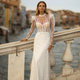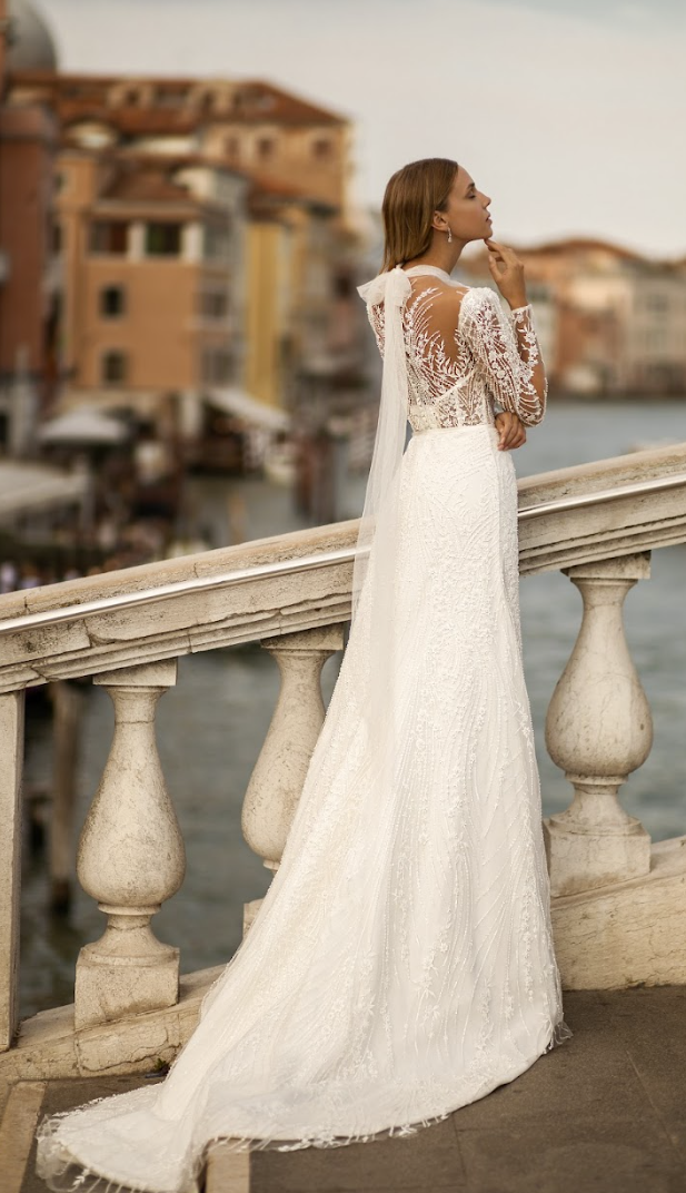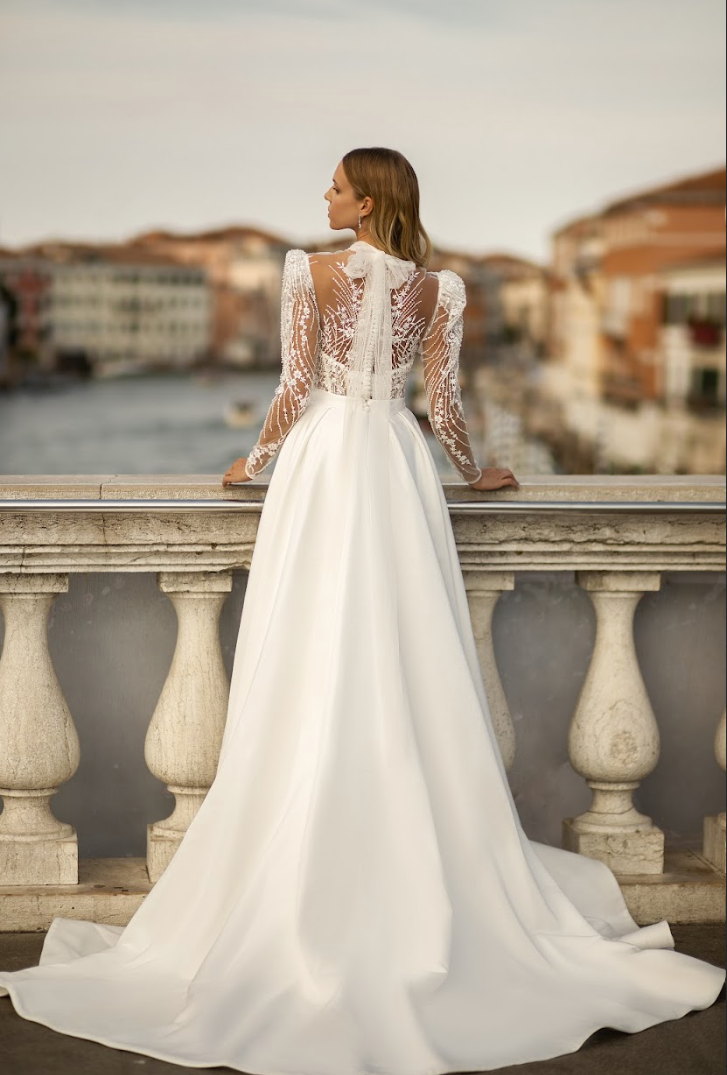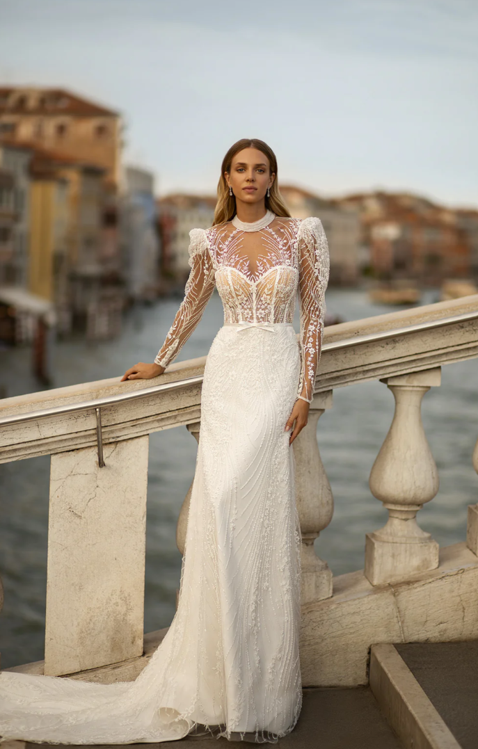 Crafted with intricate beadwork and shimmering embroidery, the illusion bodice features sculpted corsetry and exquisite long sleeves adorned with delicately placed botanical motifs that dance across the skin. Subtle puff shoulders add a hint of drama and vintage charm, balanced by the gown’s graceful silhouette. The high illusion neckline provides a sophisticated contrast to the figure-enhancing design beneath, while the semi-sheer back adds a whisper of allure.