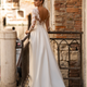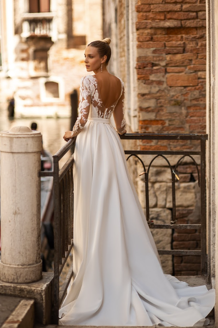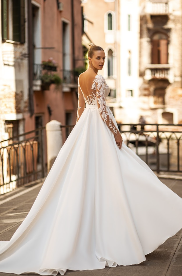 Pair this gown with pearl drop earrings, soft romantic waves or a sleek chignon, and strappy satin heels to complement the slit’s sultry appeal. Perfect for grand indoor ceremonies, historic estate weddings, or intimate sunset vows on a terrace overlooking the city.