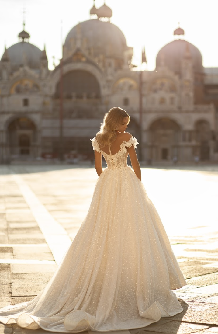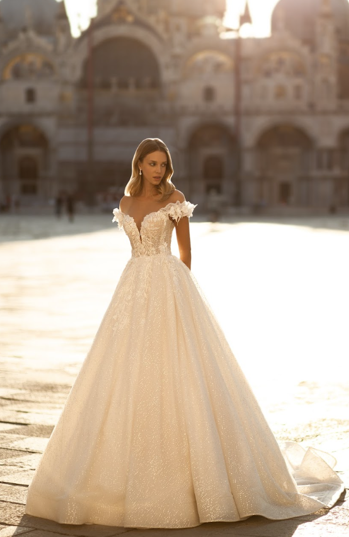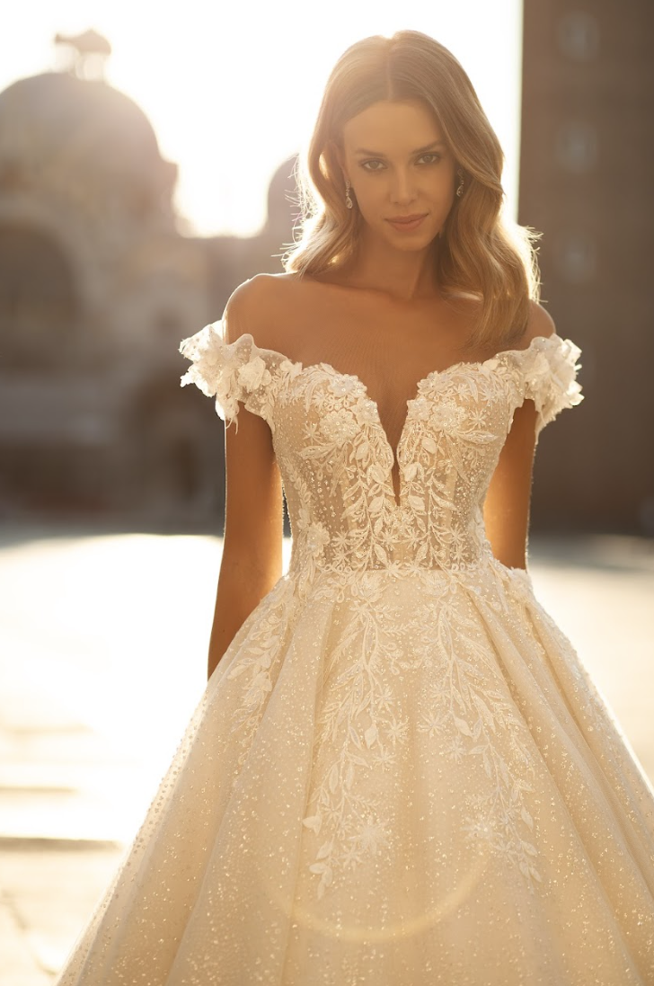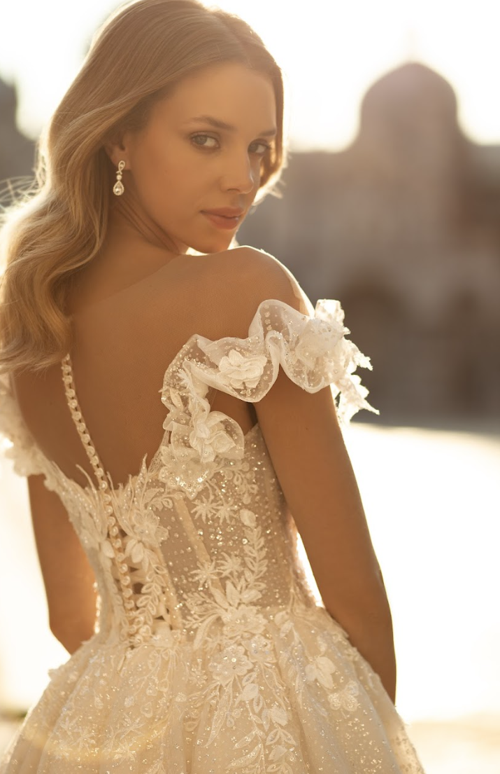 A vision of romantic radiance, The Zephyra Gown captures the essence of ethereal elegance. Crafted in a shimmering fabric that dances in the light, this off-the-shoulder ballgown features an enchanting sweetheart illusion neckline with soft floral appliqués that delicately cascade over the shoulders. Intricate embroidery and beadwork create a graceful botanical motif across the structured bodice, seamlessly flowing into a voluminous skirt that glimmers with every step. The subtle sparkle and soft texture of the gown evoke a dreamy, fairytale aura — perfect for the bride who seeks timeless grandeur with a modern whisper of whimsy.