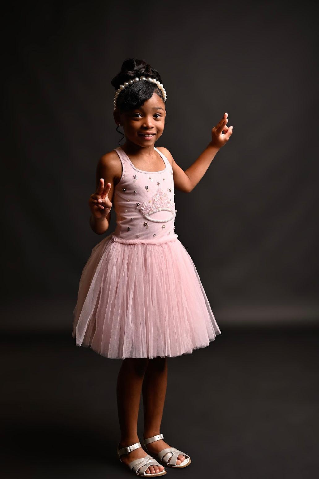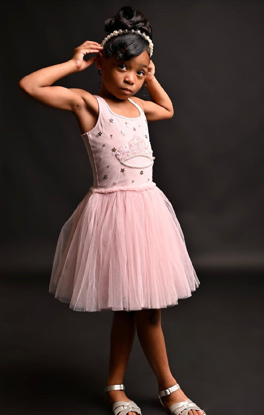 Let your little one embrace her inner royalty with our Royal Crown Tutu Dress. This enchanting dress features a beautifully embroidered crown on the bodice, adorned with sparkling sequins and gems that add a regal touch. The soft pink hue of the dress complements its delicate design, making it perfect for any princess-inspired occasion.