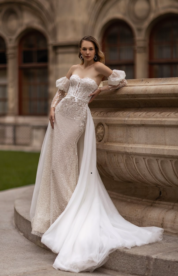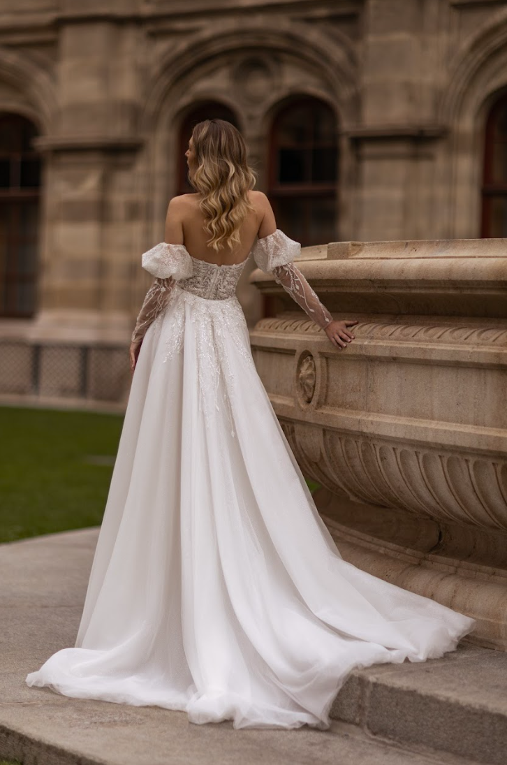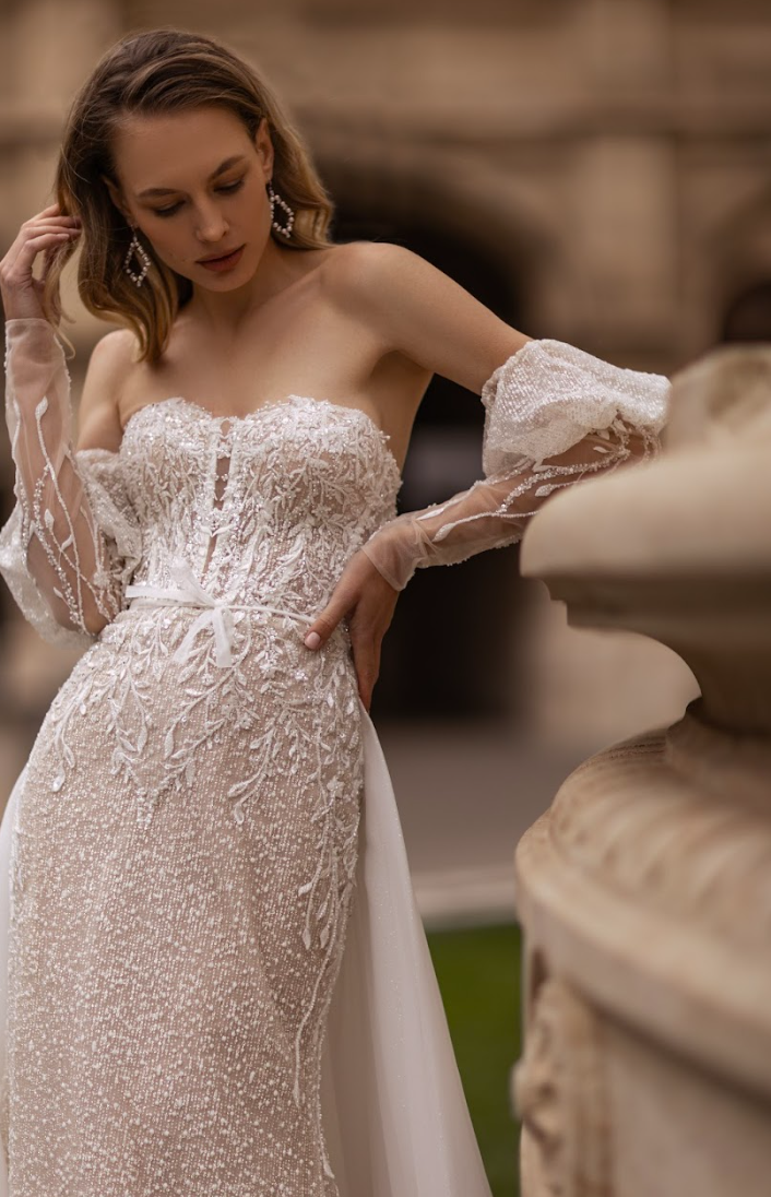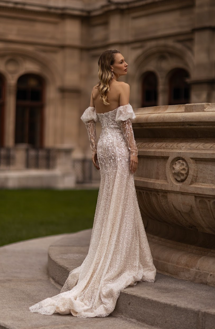 The Elisavette features a figure-sculpting silhouette adorned with intricate hand-embroidered lace and delicate shimmering beadwork that cascades across the bodice and hips. The off-the-shoulder illusion neckline melts into sheer, detachable long lace sleeves — a romantic touch that offers two breathtaking looks in one. Every floral motif and bead is meticulously placed, creating a soft, glistening finish that catches the light with every movement.