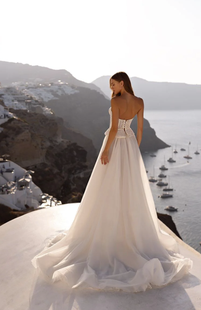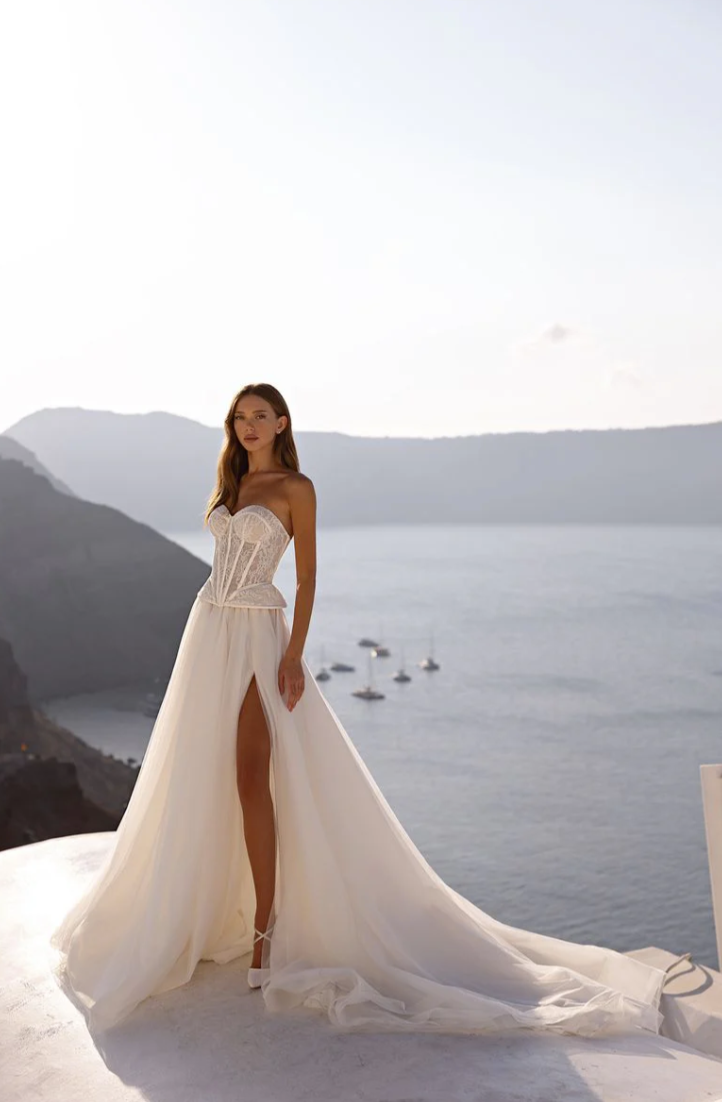 A breathtaking blend of grace and sensuality, the Isla Gown redefines modern bridal elegance. Featuring a sculpted, semi-sheer corset bodice adorned with delicate lace appliqué and structured boning, this dress accentuates your silhouette with romantic precision. The strapless sweetheart neckline draws the eye to the décolletage, while the softly flared chiffon skirt cascades effortlessly to the floor, creating movement with every step.