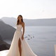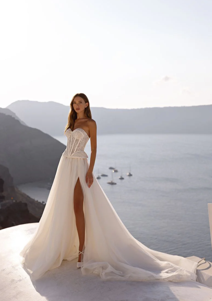 A daring thigh-high slit adds a captivating edge to this otherwise ethereal design—perfect for the bride who desires both timeless sophistication and contemporary allure. The soft A-line silhouette ensures a flattering fit for a variety of body shapes, while the gentle sweep train adds just the right touch of drama.