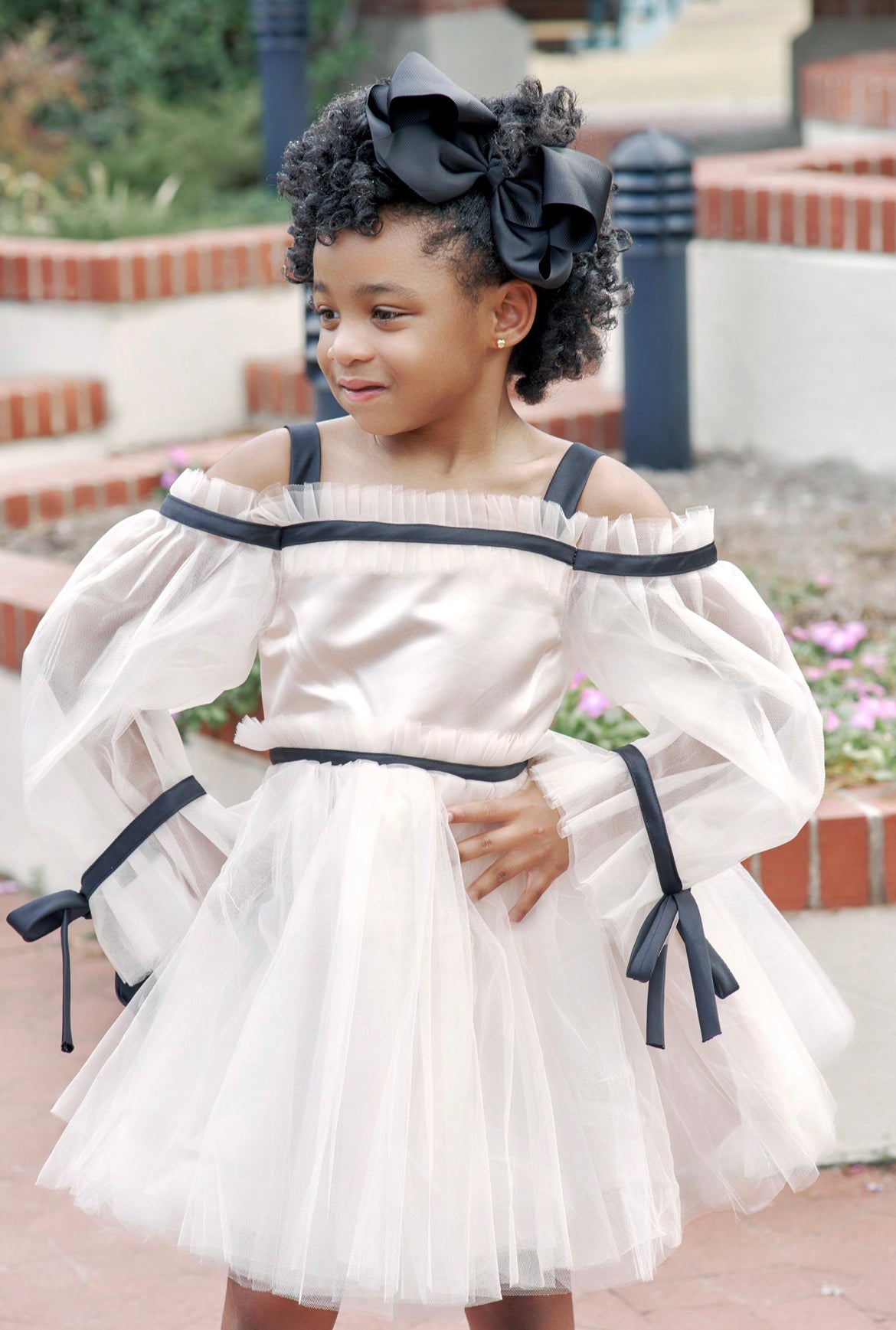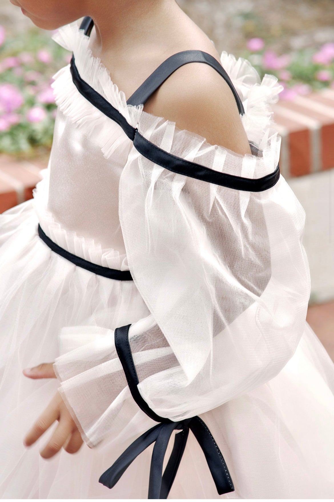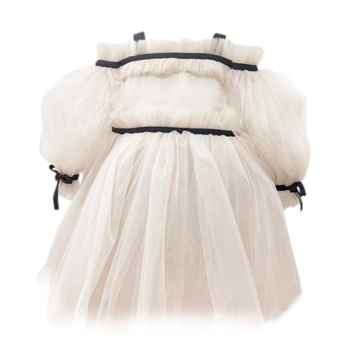 - Design: The dress features soft, voluminous tulle fabric with a delicate off-shoulder style, accented by striking black ribbon details around the bodice, sleeves, and waistline. The puffed sleeves add a touch of drama and elegance, making this dress perfect for formal events, birthdays, or holiday celebrations.