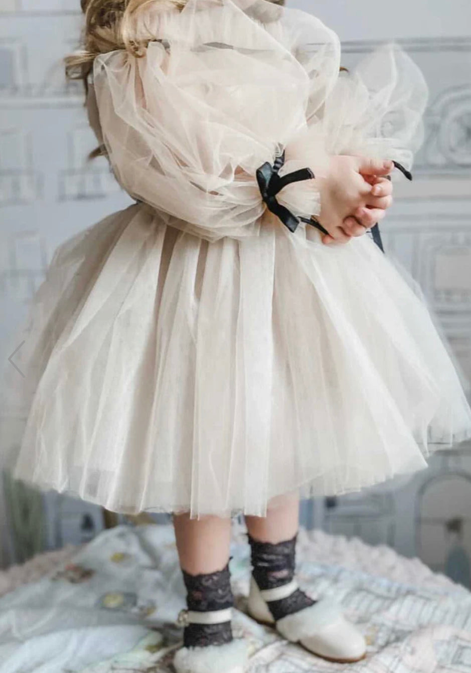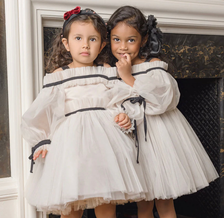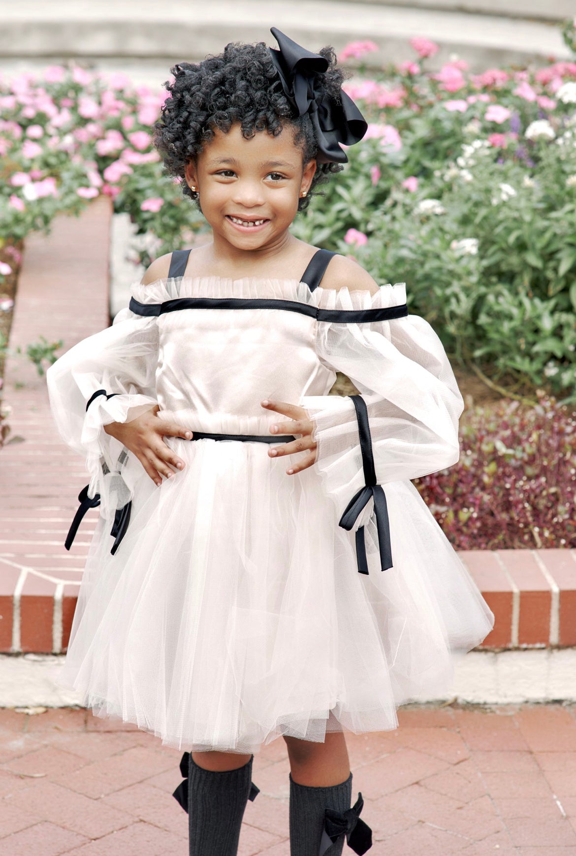 - Design: The dress features soft, voluminous tulle fabric with a delicate off-shoulder style, accented by striking black ribbon details around the bodice, sleeves, and waistline. The puffed sleeves add a touch of drama and elegance, making this dress perfect for formal events, birthdays, or holiday celebrations.