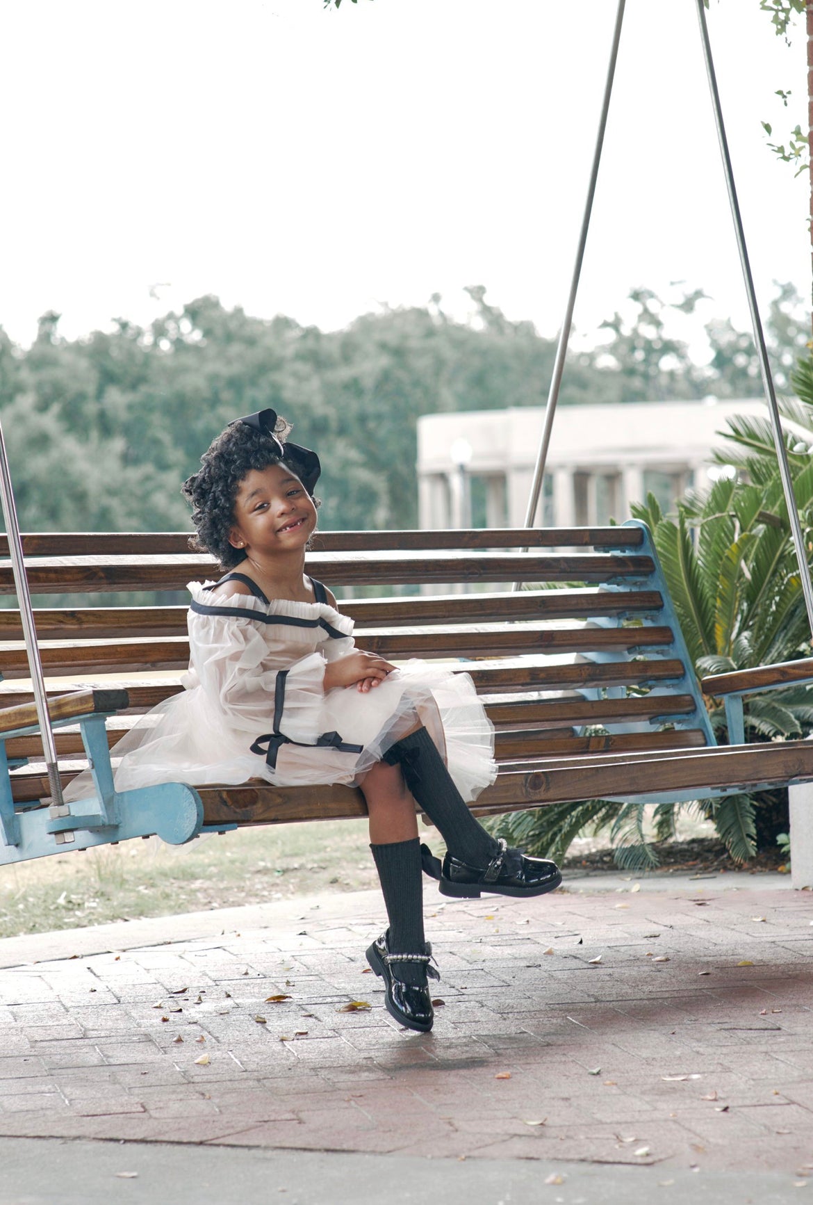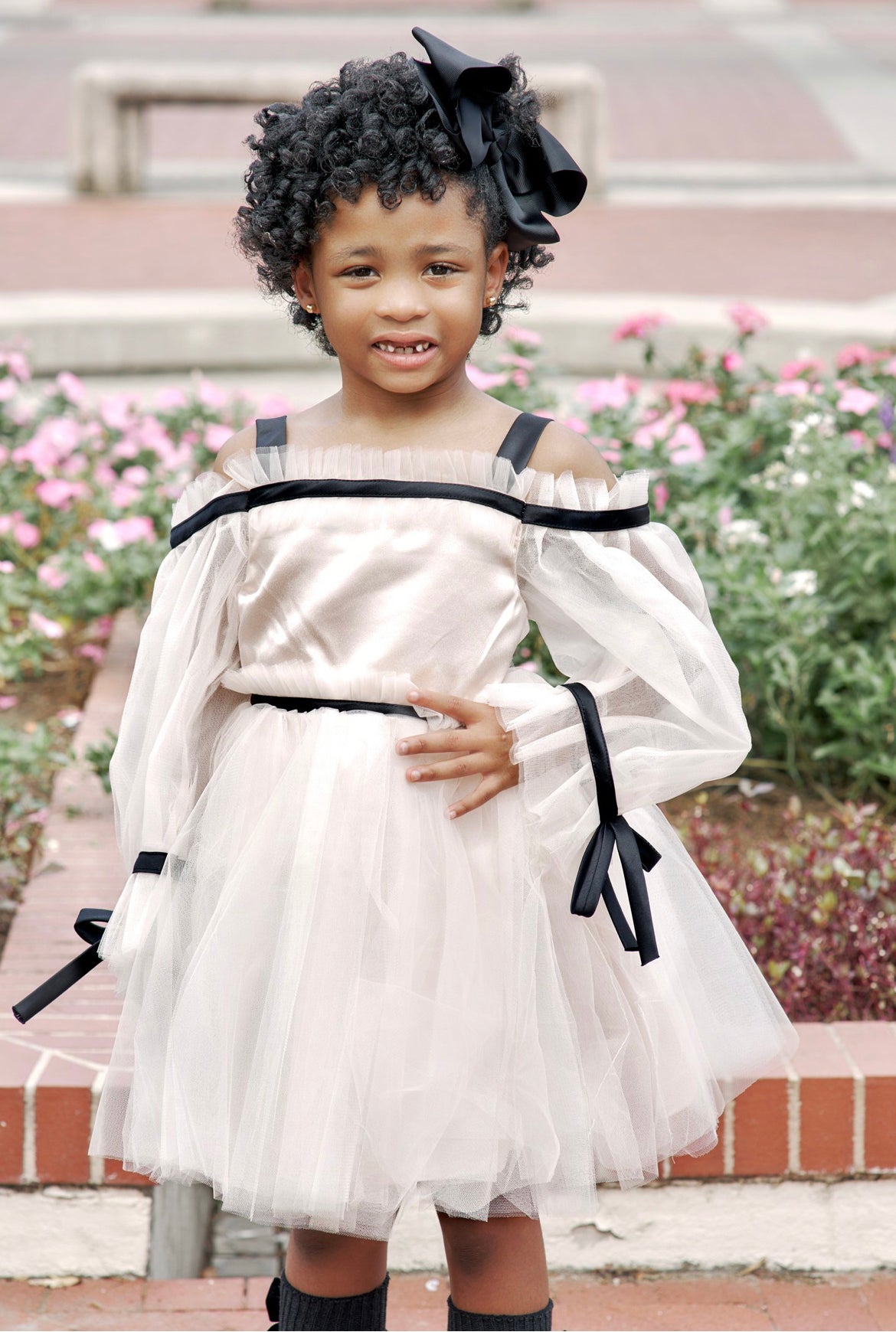 This sophisticated and charming off-shoulder tulle dress is designed for your little fashionista to shine on special occasions.