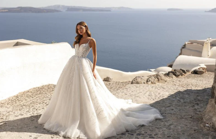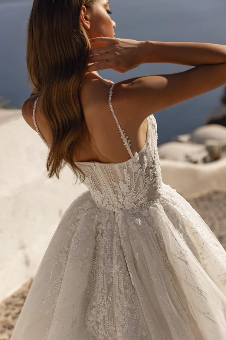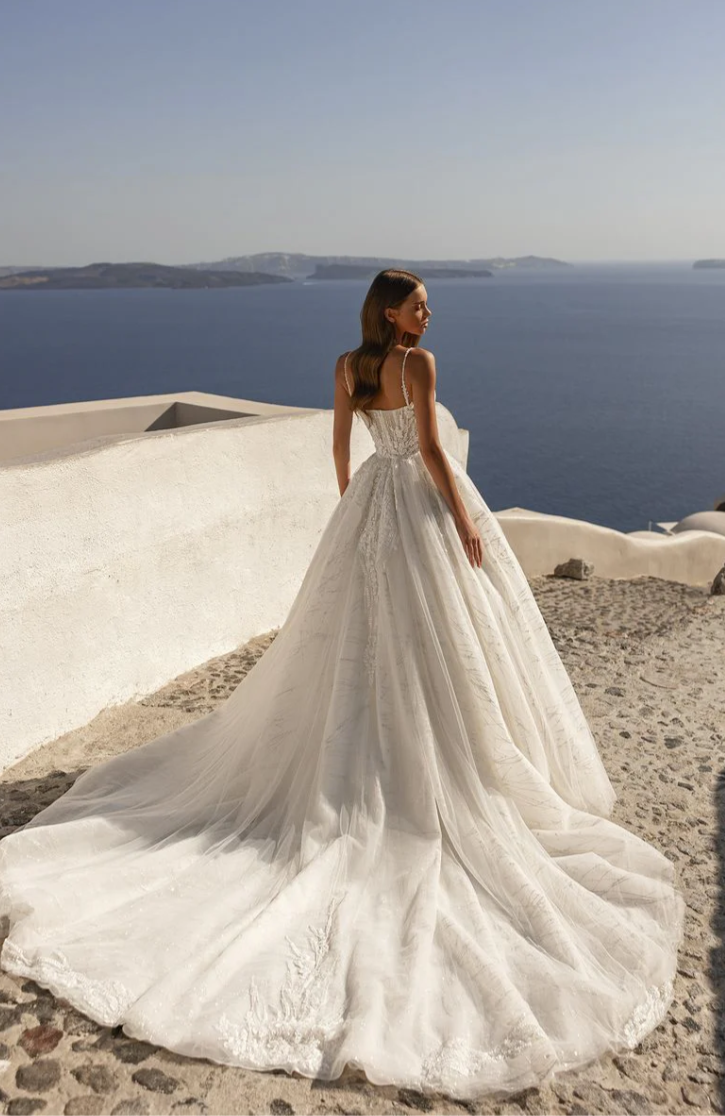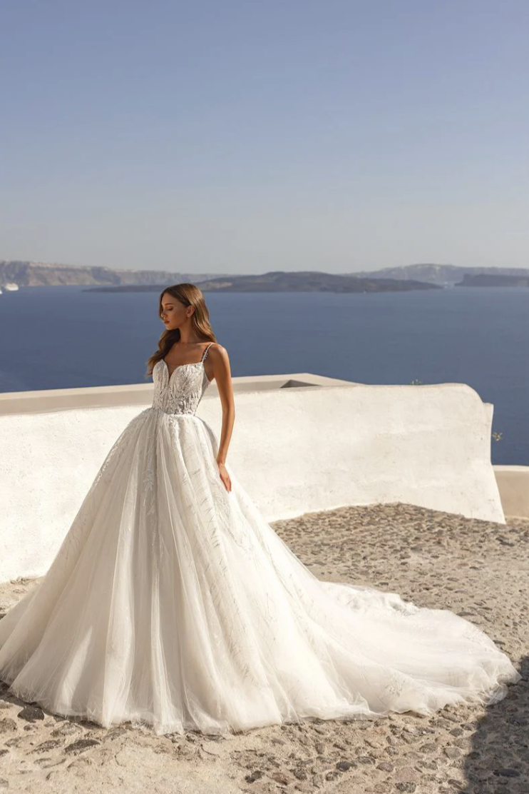 Style Inspiration: Pair this gown with crystal chandelier earrings, soft waves or a romantic half-up hairstyle, and a long cascading cathedral veil for a look that radiates fairytale sophistication. Perfect for castle weddings, garden ceremonies, or luxe ballroom affairs.