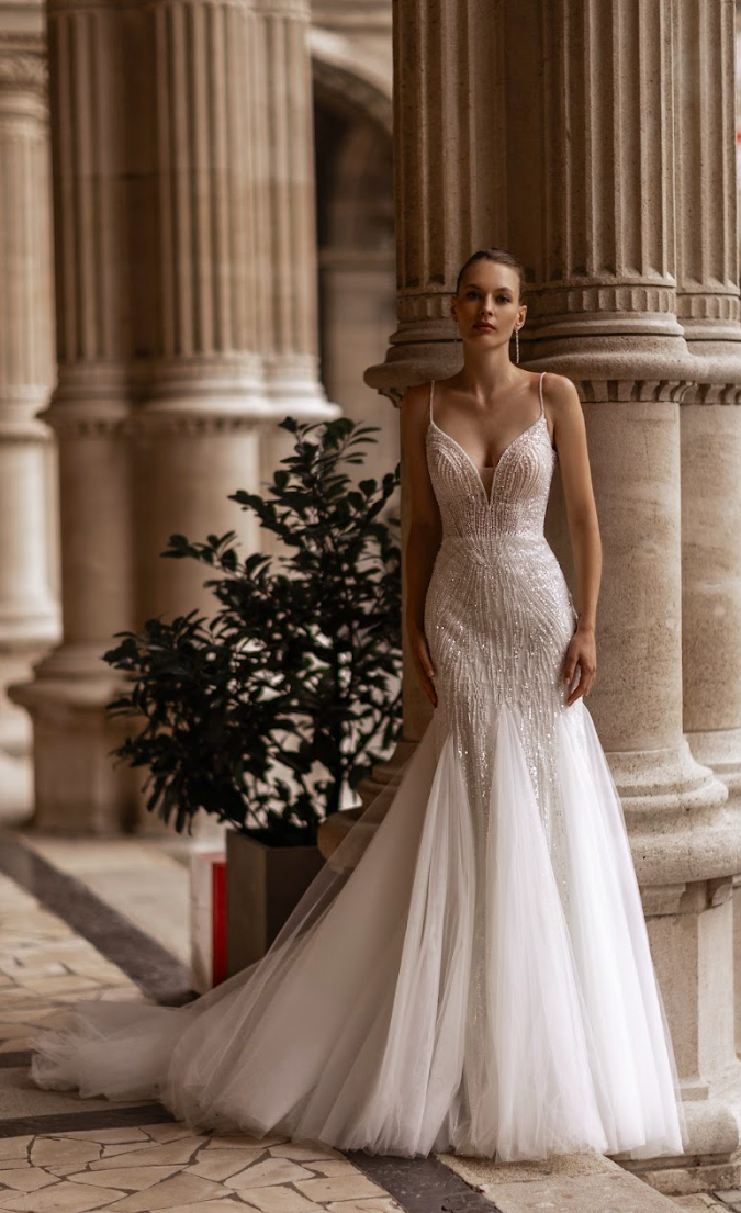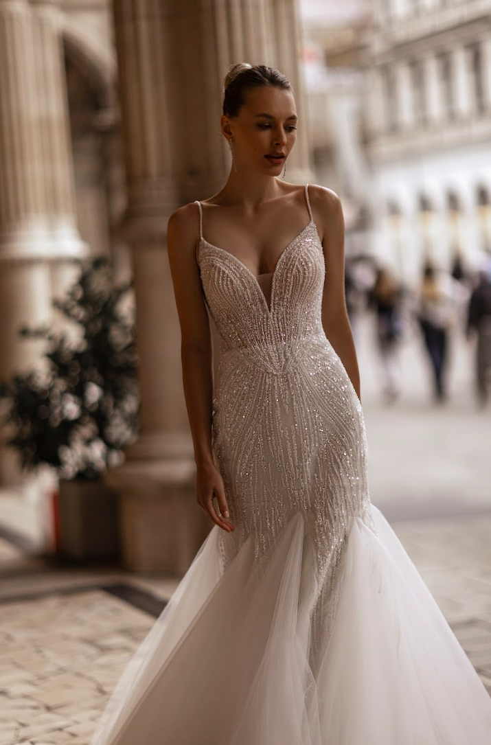 Dazzling with sophistication, the Lunessa Gown is a radiant masterpiece designed for the bride who seeks glamour, elegance, and an unforgettable silhouette. This breathtaking mermaid-style gown features a curve-enhancing beaded bodice that shimmers with thousands of hand-applied sequins and pearls, forming intricate linear patterns that cascade gracefully down the gown.