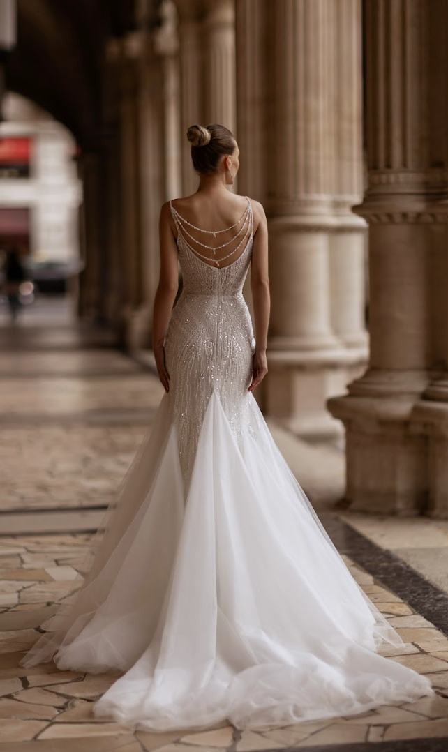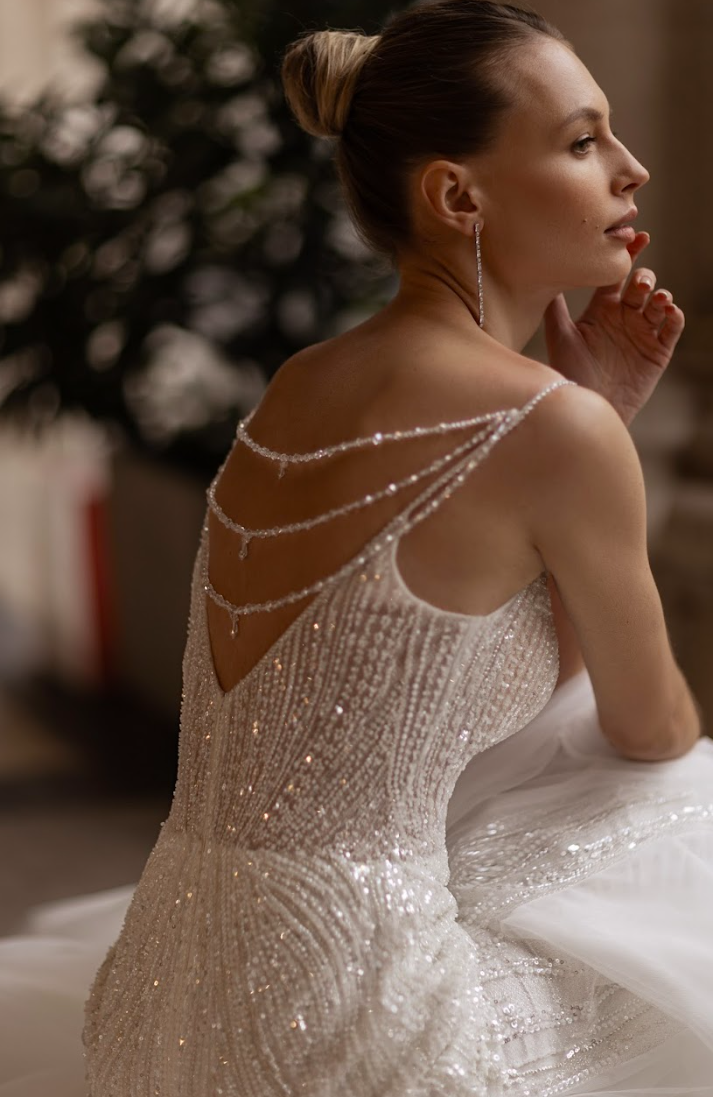 The fitted silhouette transitions effortlessly into a voluminous tulle trumpet skirt, creating a romantic and ethereal train that flows with regal grace. Delicate spaghetti straps frame the décolletage, leading into a captivating low scoop back adorned with cascading crystal chain embellishments—an exquisite detail that adds a touch of opulence and modern femininity.