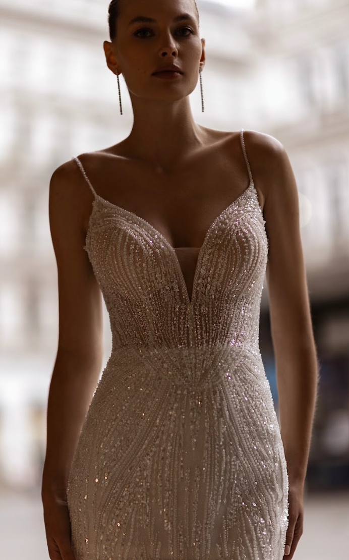 Pair this gown with crystal drop earrings, a sleek chignon bun, and a cathedral-length veil for a look that radiates red carpet glamour. Perfect for grand ballroom weddings, elegant evening affairs, or a luxe destination celebration under the stars.
