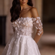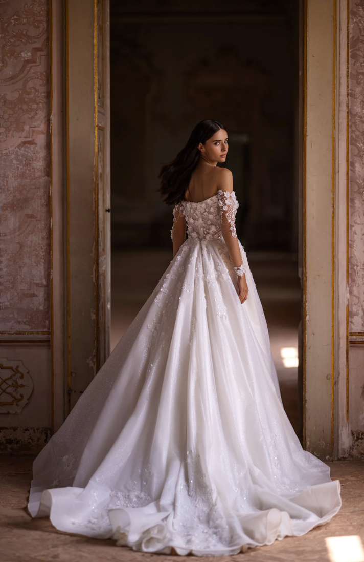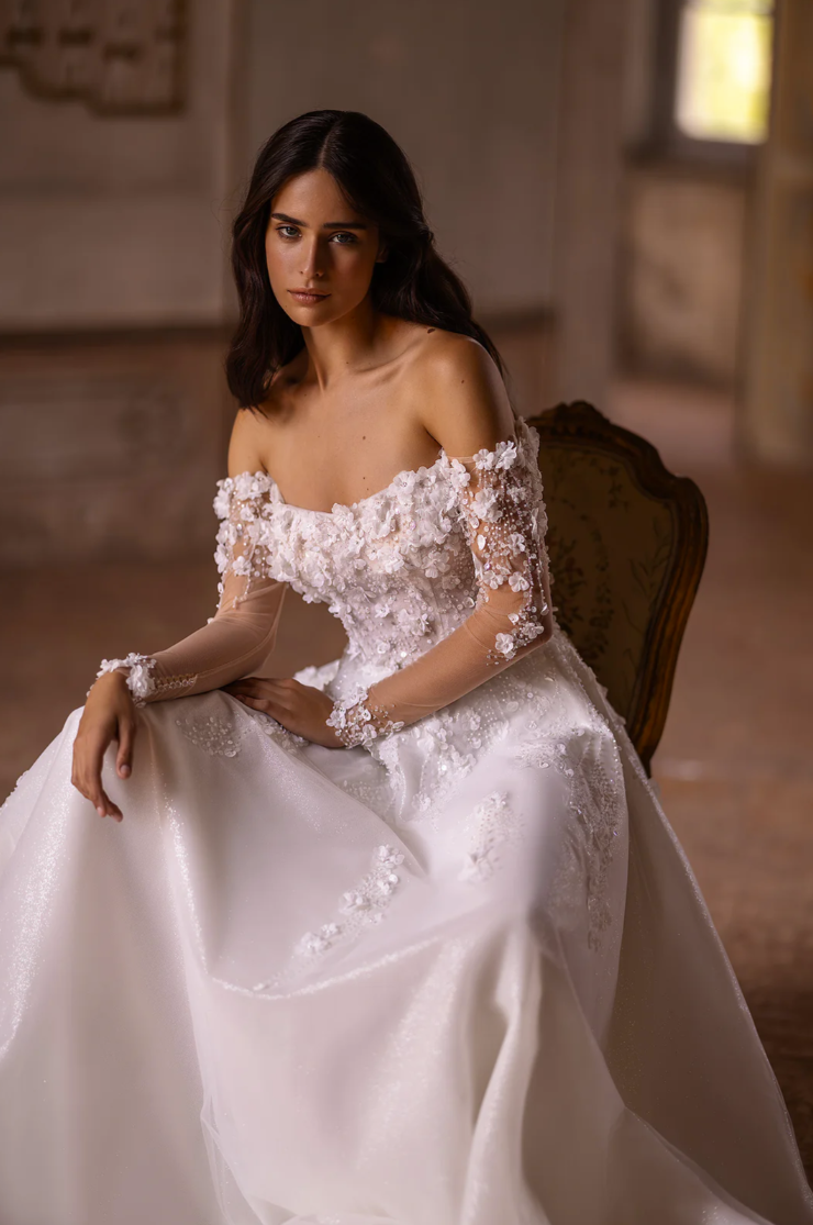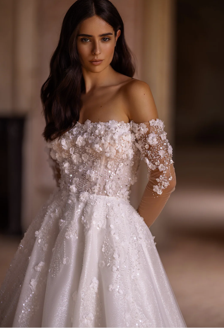 Captivate every heart as you glide down the aisle in the enchanting Serenity gown. Crafted with breathtaking precision, this gown boasts a romantic off-the-shoulder neckline, delicately adorned with intricate floral appliqués cascading across the sheer, corset-style bodice. The luxurious sleeves are ethereally sheer, embellished with shimmering blossoms that softly embrace your arms, creating an aura of refined femininity. The voluminous skirt, crafted from airy layers of tulle sprinkled with delicate floral embroidery and subtle sparkling embellishments, gracefully flows into a dreamy, sweeping train—captivating from every angle.