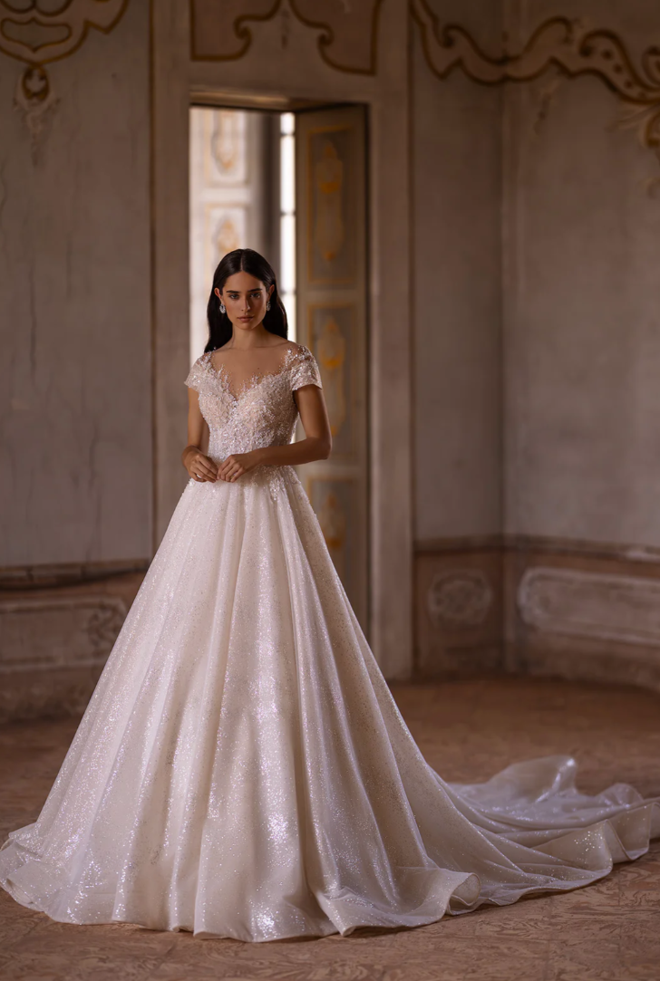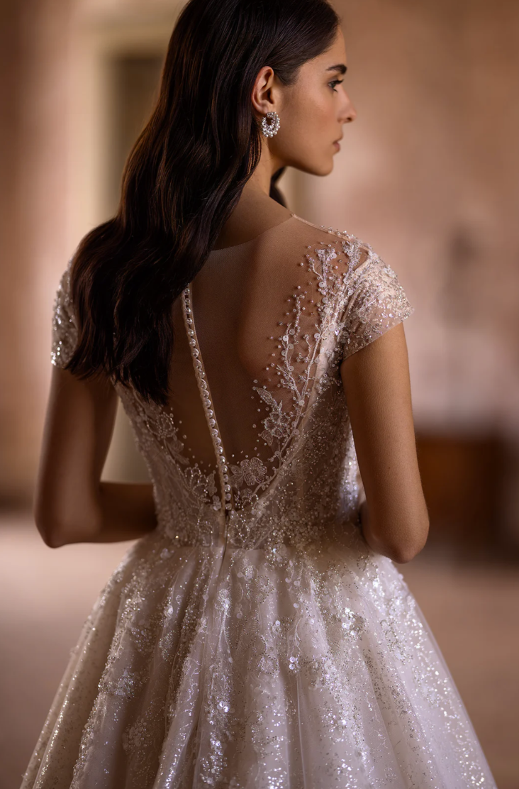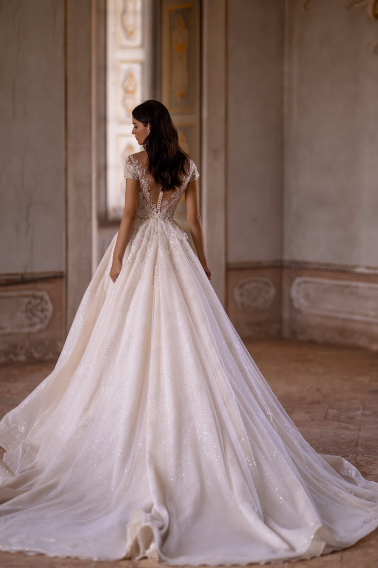 The bodice flows into a voluminous, sparkling skirt crafted from layers of glitter-infused tulle and lace. The gentle fullness adds dramatic elegance without overpowering the gown’s soft femininity. With every step, light reflects off the delicate detailing, giving the bride an angelic glow.