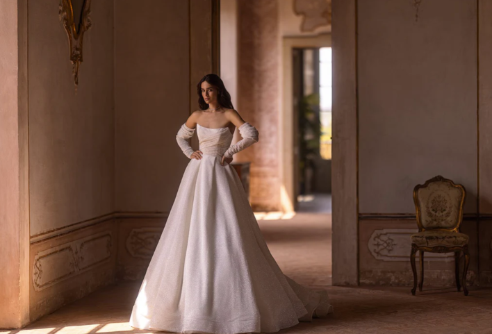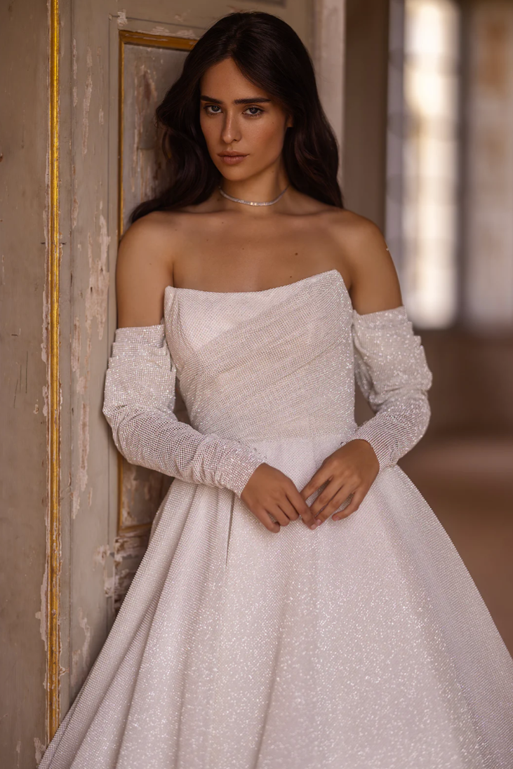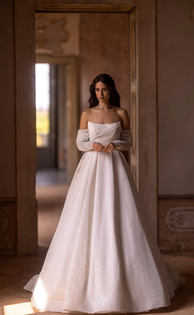 Detachable fitted sleeves, delicately embellished with micro-crystal beading, offer a versatile styling option—whether worn for a graceful ceremony look or removed for a modern reception reveal. The architectural structure of the gown enhances the waist and flows effortlessly into a full, sweeping hemline that embodies opulence.