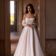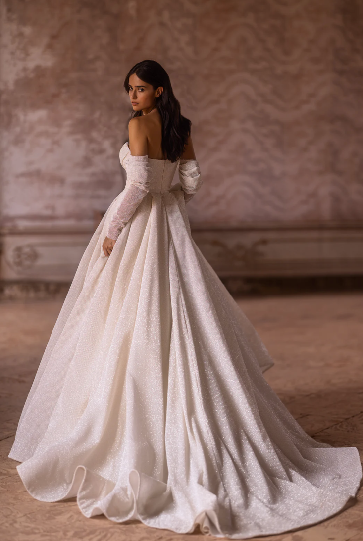 The bodice gracefully wraps around the torso in soft, diagonal pleating, creating a flattering draped effect that leads into a voluminous A-line skirt. Crafted from shimmering fabric with a luxurious texture, the skirt cascades into a dramatic train, bringing grandeur to every step down the aisle.