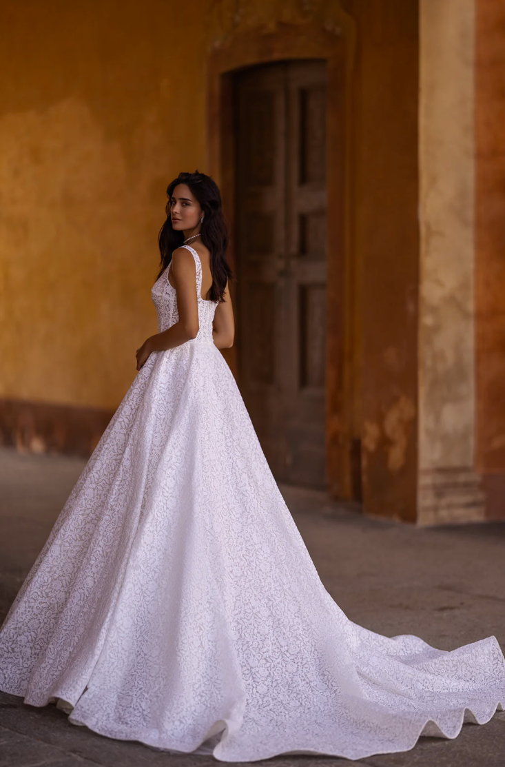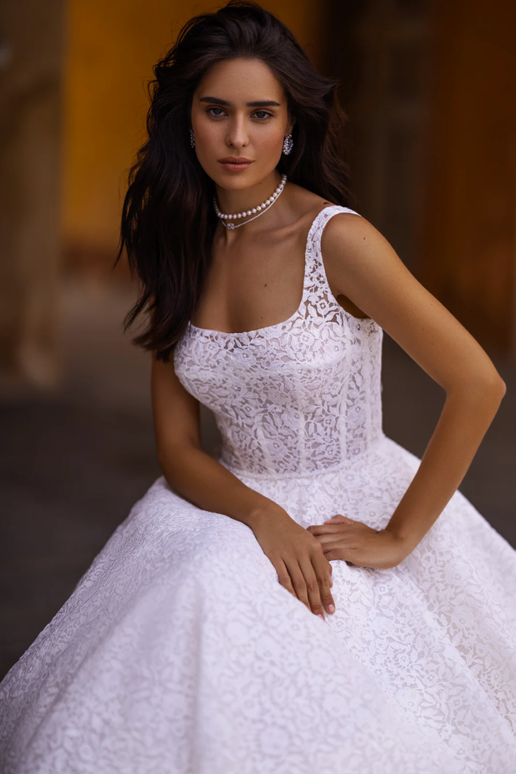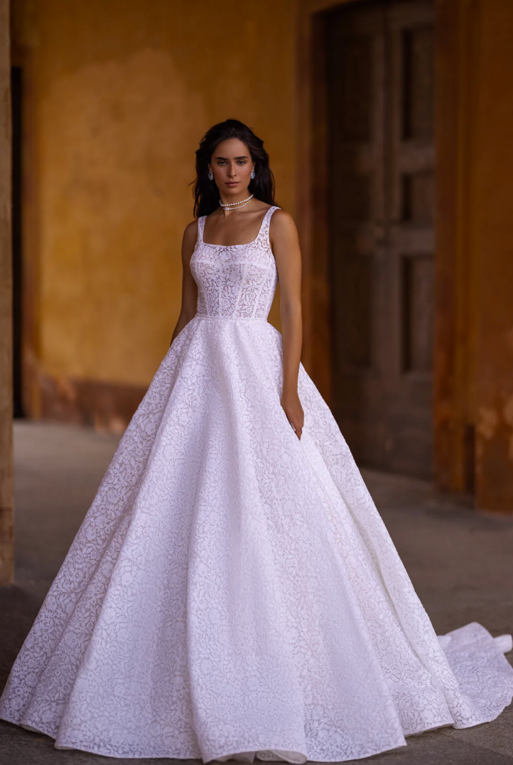 The Maravilla Gown epitomizes modern romance and timeless sophistication, creating an unforgettable bridal statement. Crafted from luxurious, structured lace, this gown boasts a classic A-line silhouette that gracefully accentuates the natural waist before cascading dramatically to the floor. The flattering square neckline adds contemporary allure, complementing the delicate lace details that adorn the fitted bodice, providing a sophisticated yet subtly alluring look.