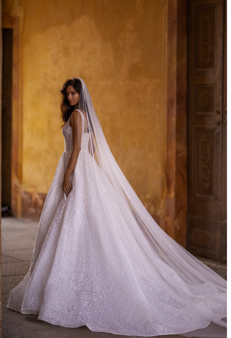 Style Inspiration: Pair this gown with diamond chandelier earrings, a pearl choker, and a cathedral-length veil delicately edged in lace, for a look that radiates sophisticated elegance. Perfect for romantic garden weddings, historic venues, or grand ballroom celebrations.